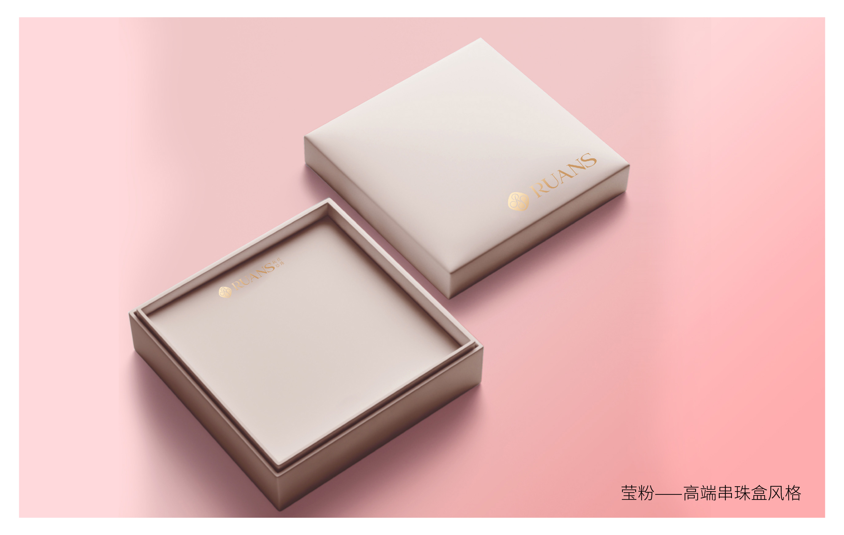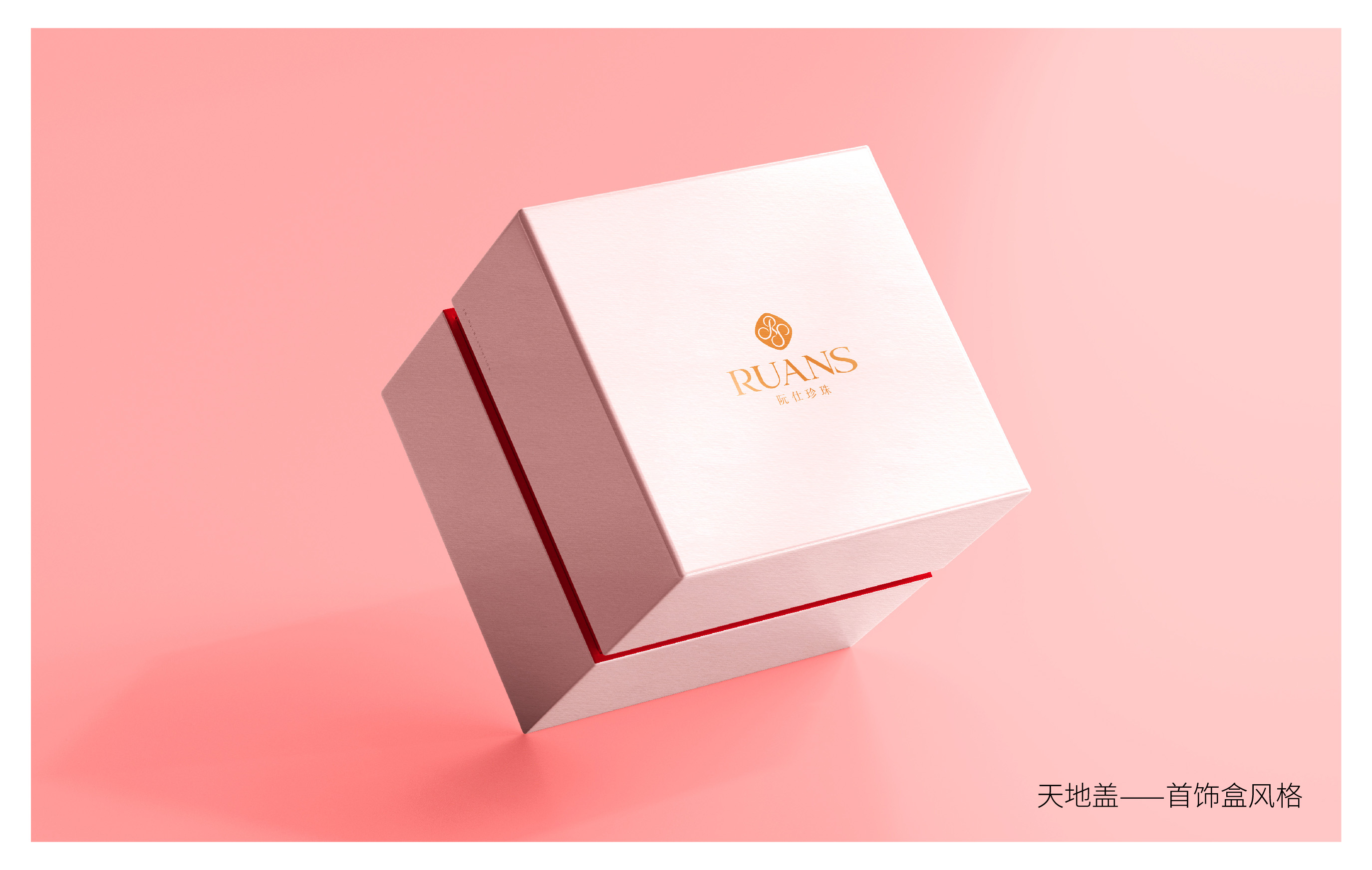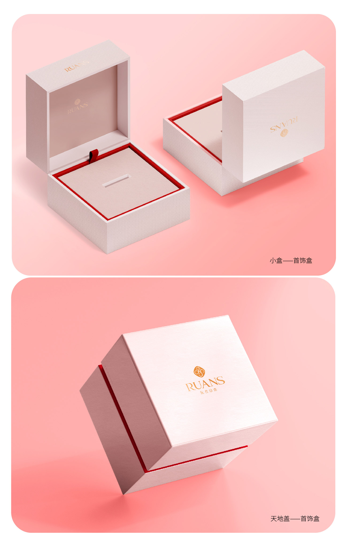 RUANS阮仕珍珠首饰盒凝练了品牌的优雅基因,以珍珠莹白、珍珠的柔粉为主色调,穿插品牌的的高贵红色,打造极具现代简洁的包装风格,将珍珠散发的自然光泽,通过珠光艺术纸的工艺呈现,将包装与产品与品牌完美的契合。