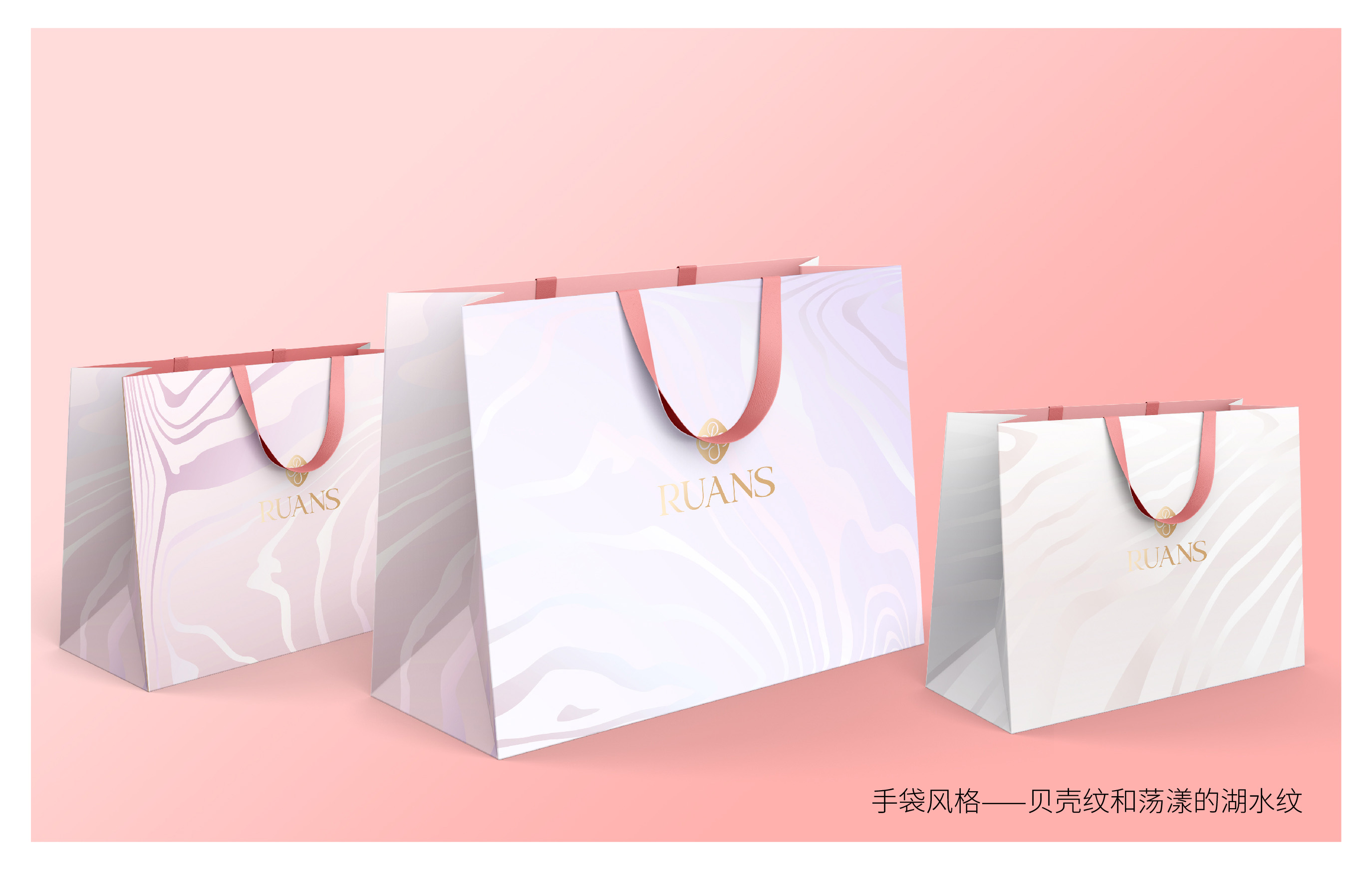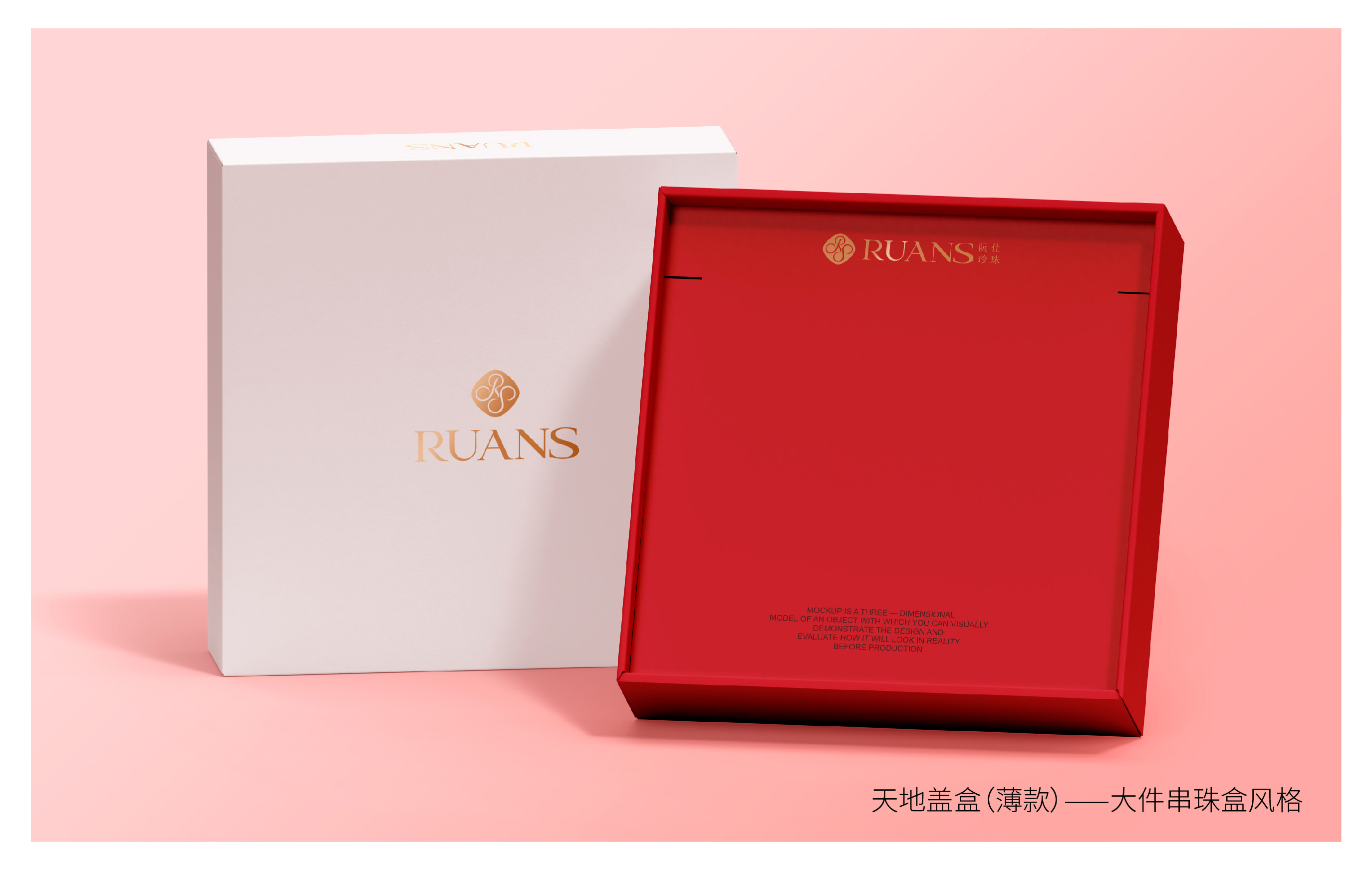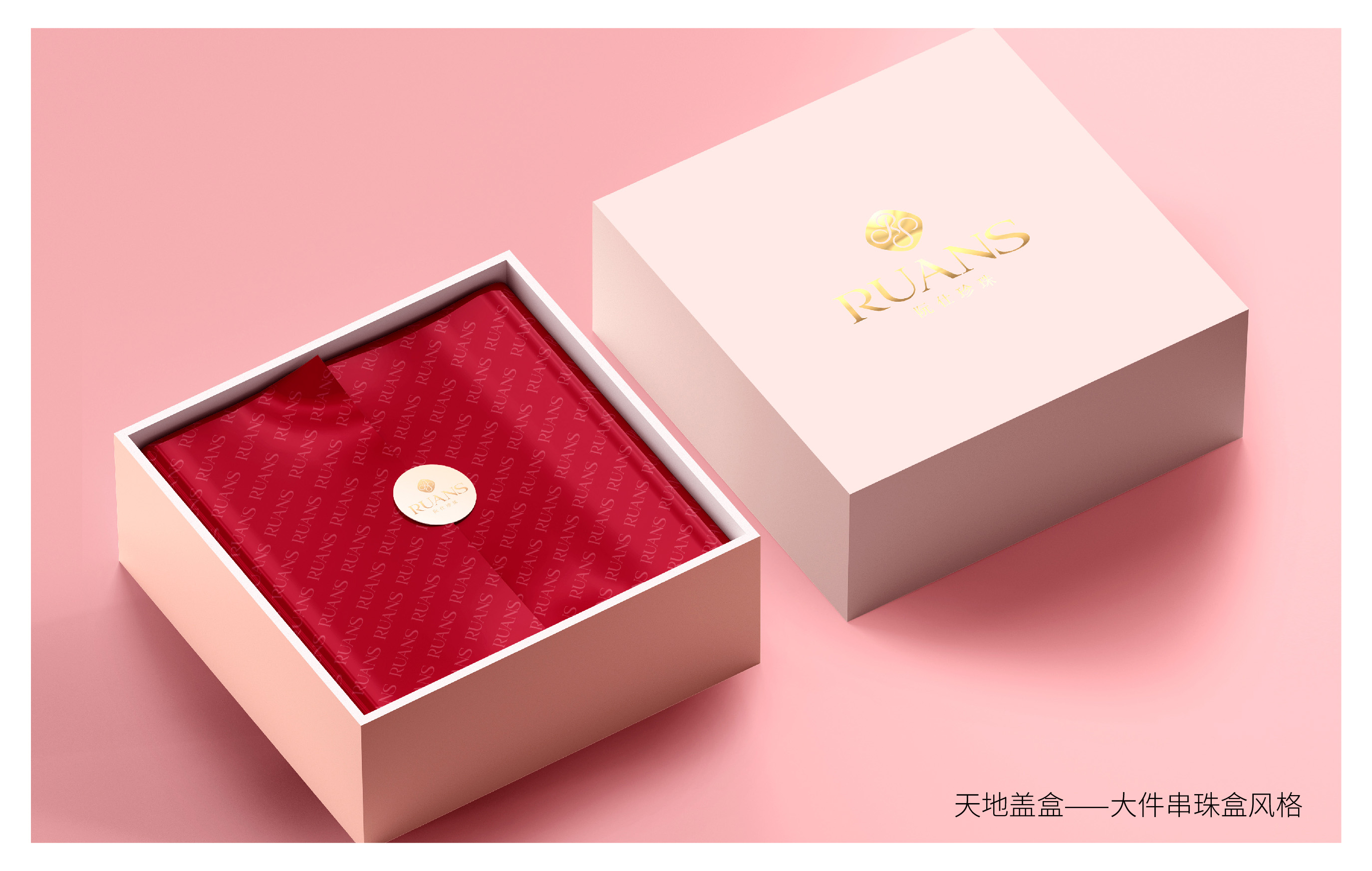 RUANS阮仕珍珠首饰盒凝练了品牌的优雅基因,以珍珠莹白、珍珠的柔粉为主色调,穿插品牌的的高贵红色,打造极具现代简洁的包装风格,将珍珠散发的自然光泽,通过珠光艺术纸的工艺呈现,将包装与产品与品牌完美的契合。