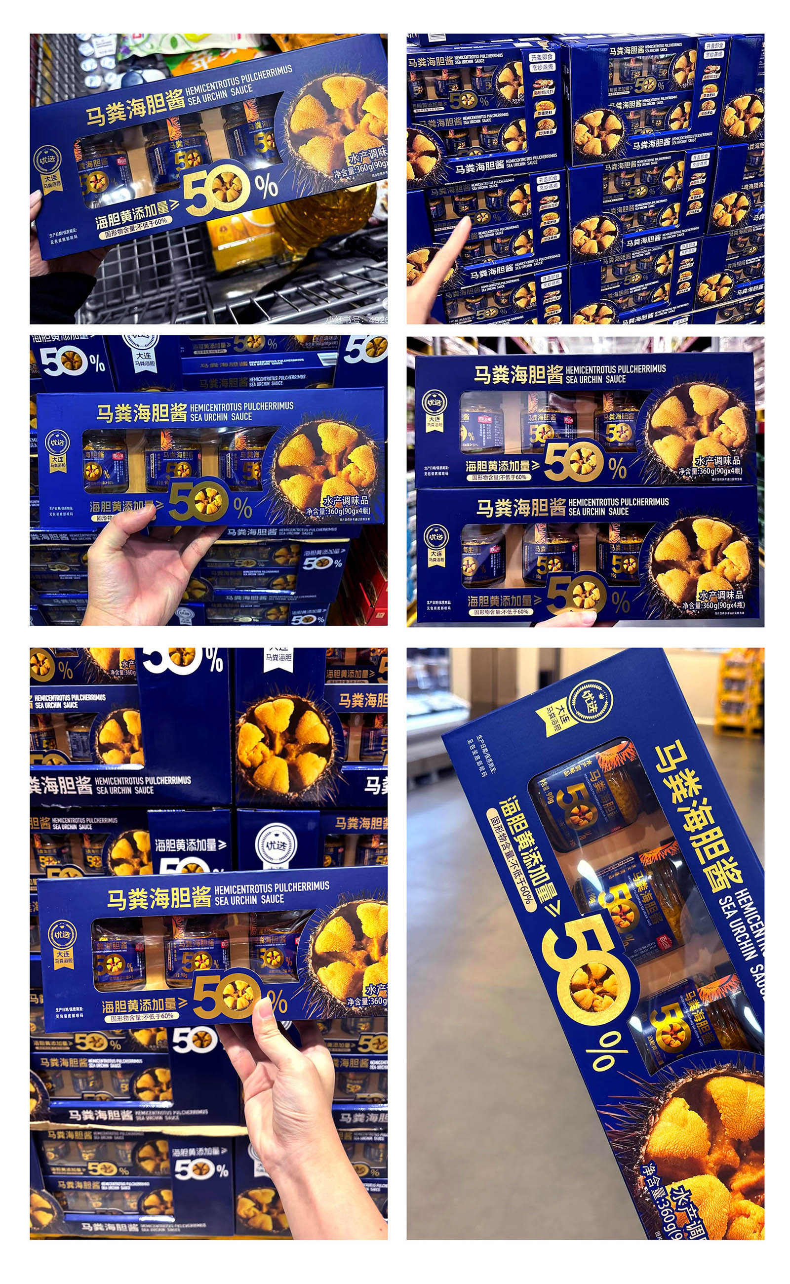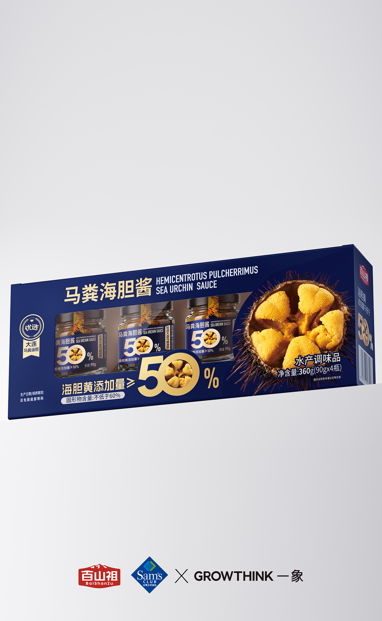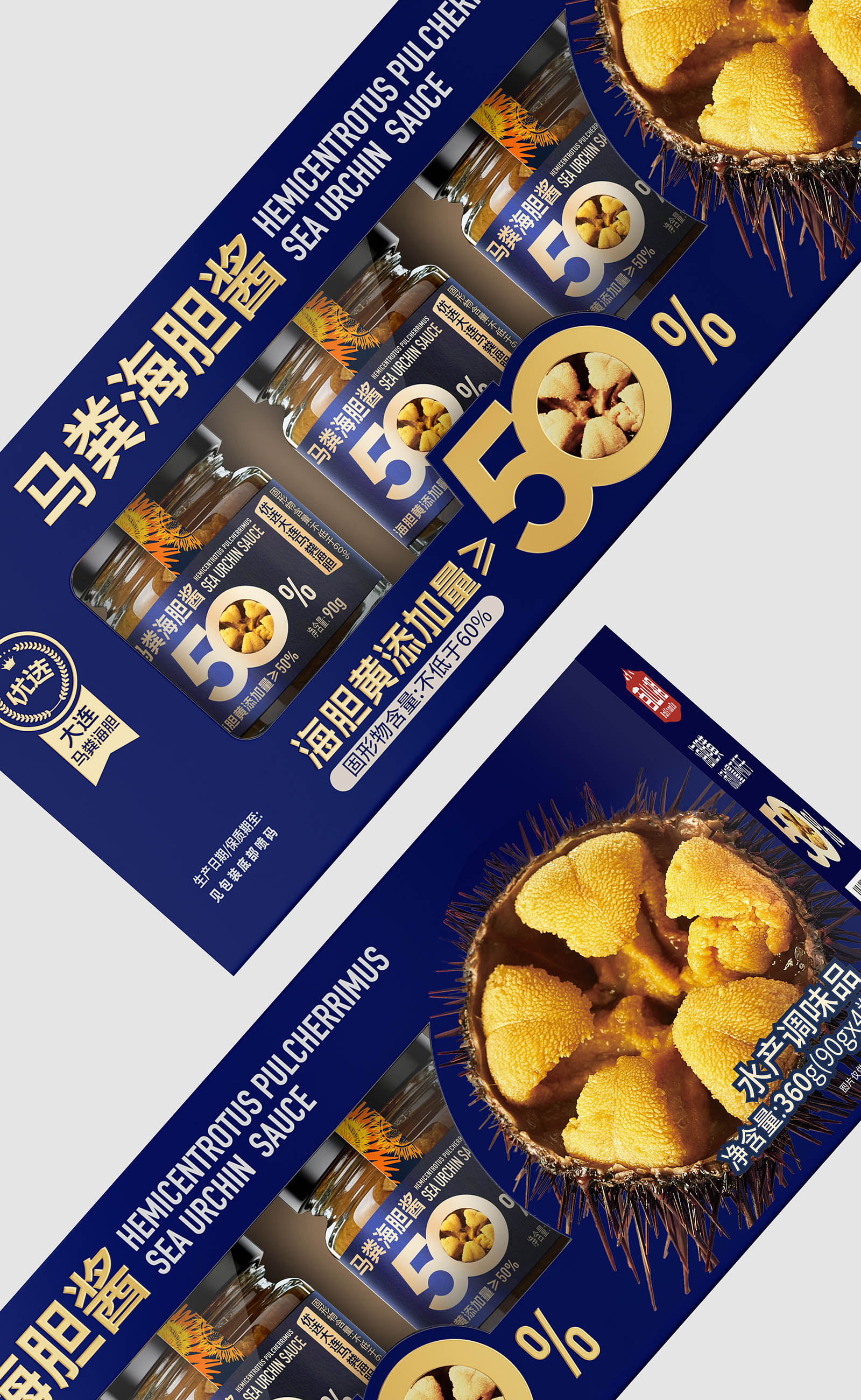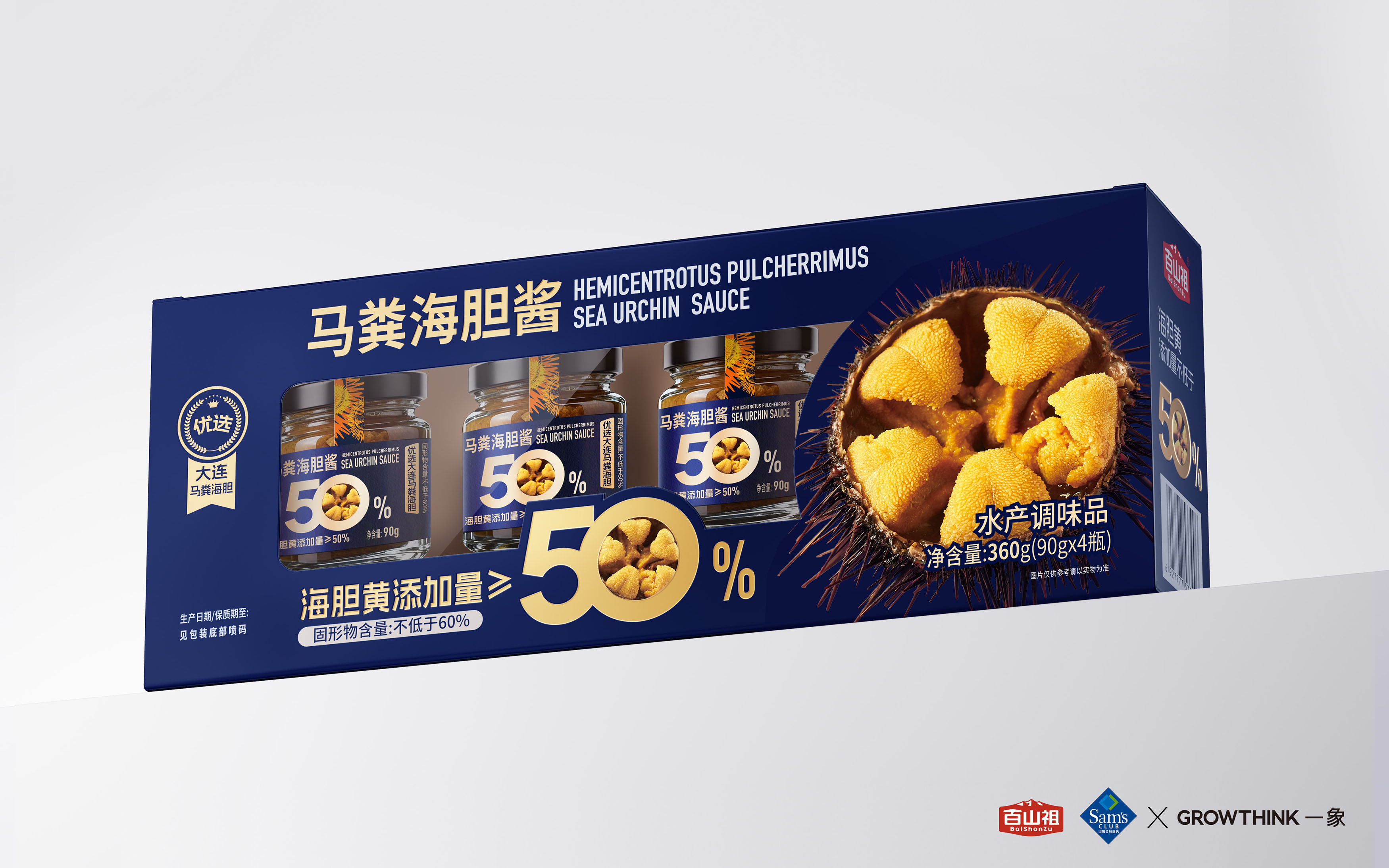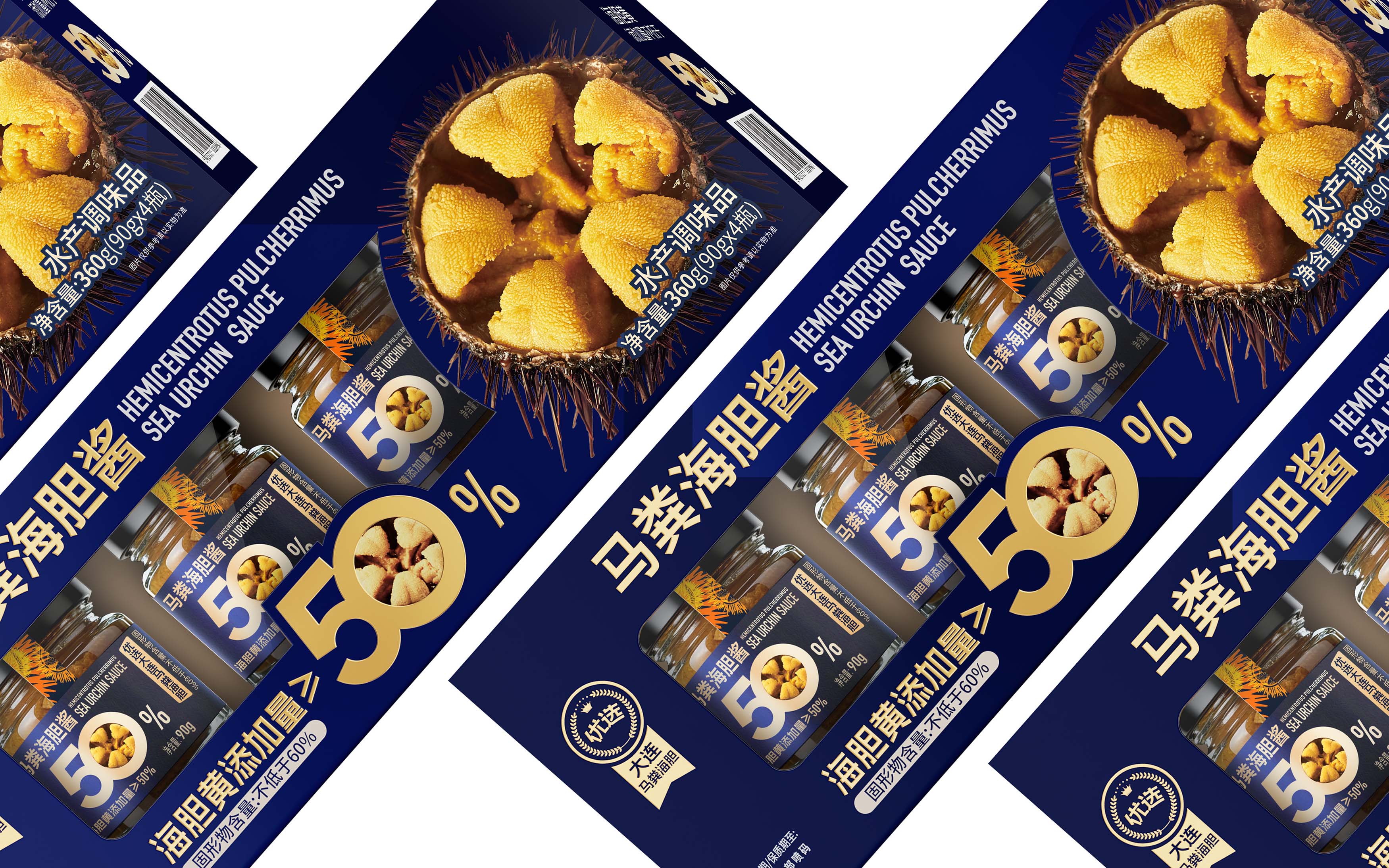 从视觉呈现上,采用深海蓝为主色调,既契合海胆的海洋属性,又传递出高端、纯净的质感。醒目的“海胆黄添加量≥50%”核心视觉点与海胆做强关联!让大家直接能换算出马粪海胆的价格,超值!以大比例字体和金色视觉符号强化,1秒抓住消费者对产品核心卖点的关注,满足山姆会员对品质与性价比的双重追求。同时,真实海胆黄的具象化展示,直观唤醒味蕾联想,将“鲜味放大”的产品定位通过视觉语言充分传达。即刻排除客户犹豫的货架售卖思维!