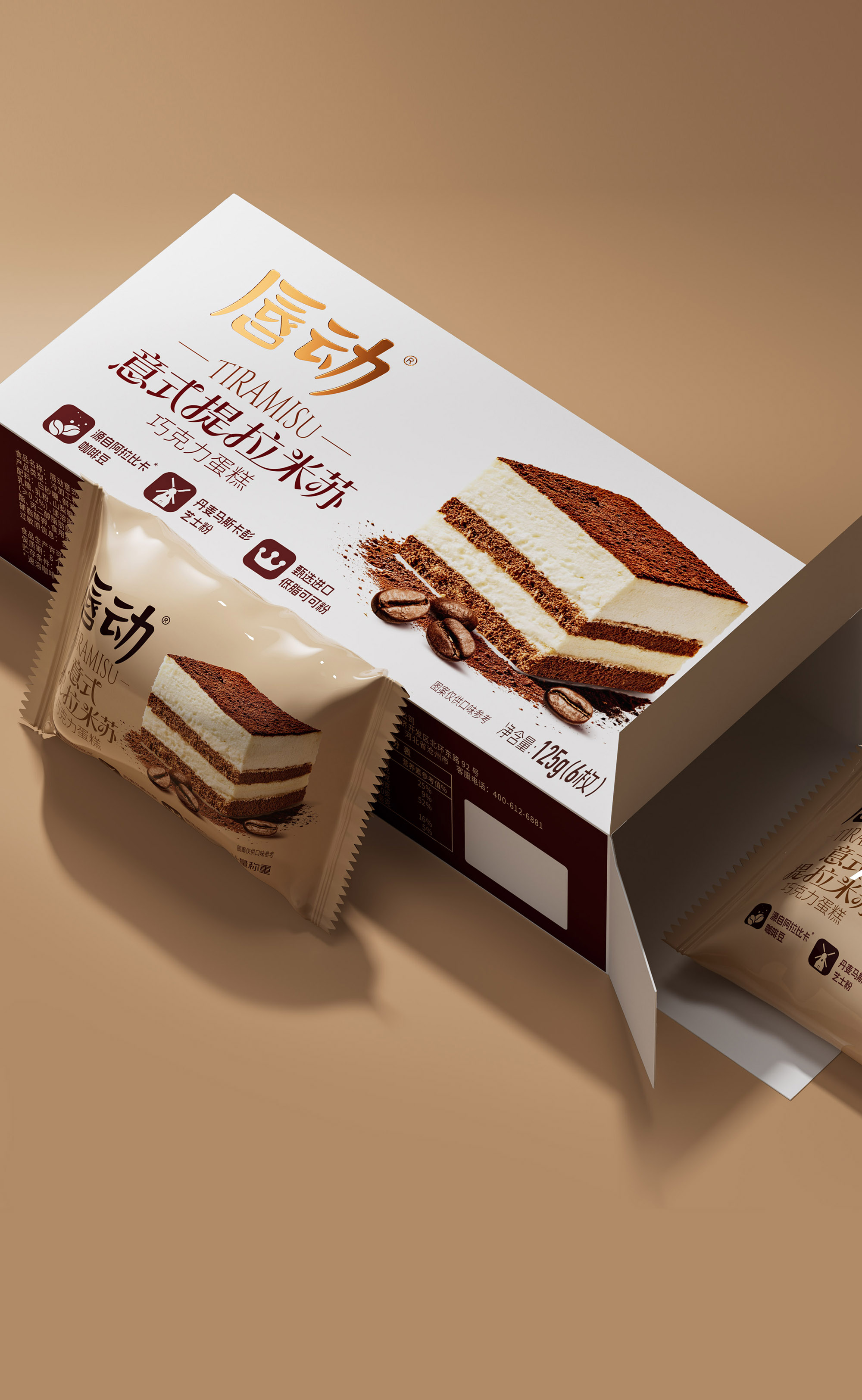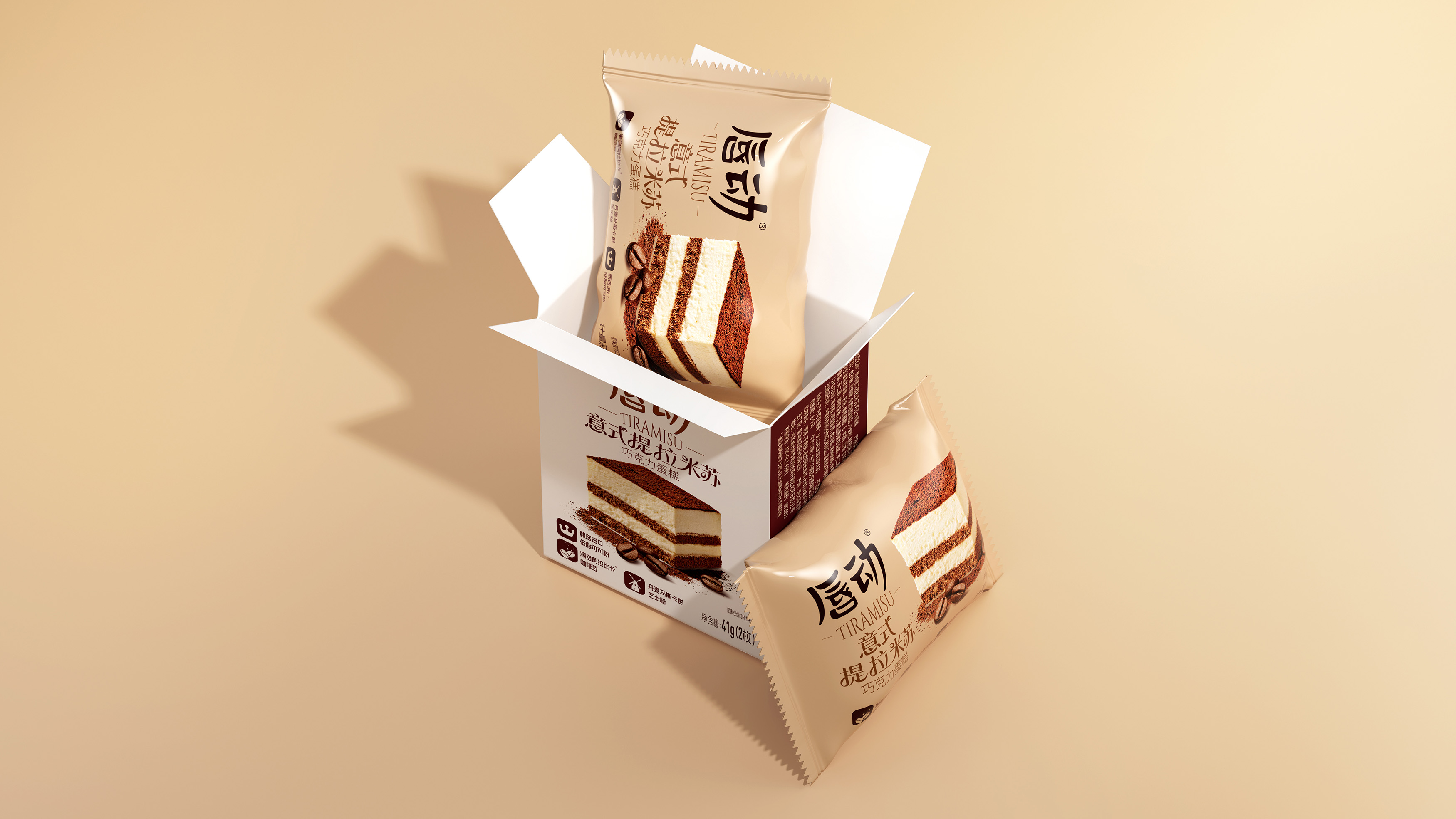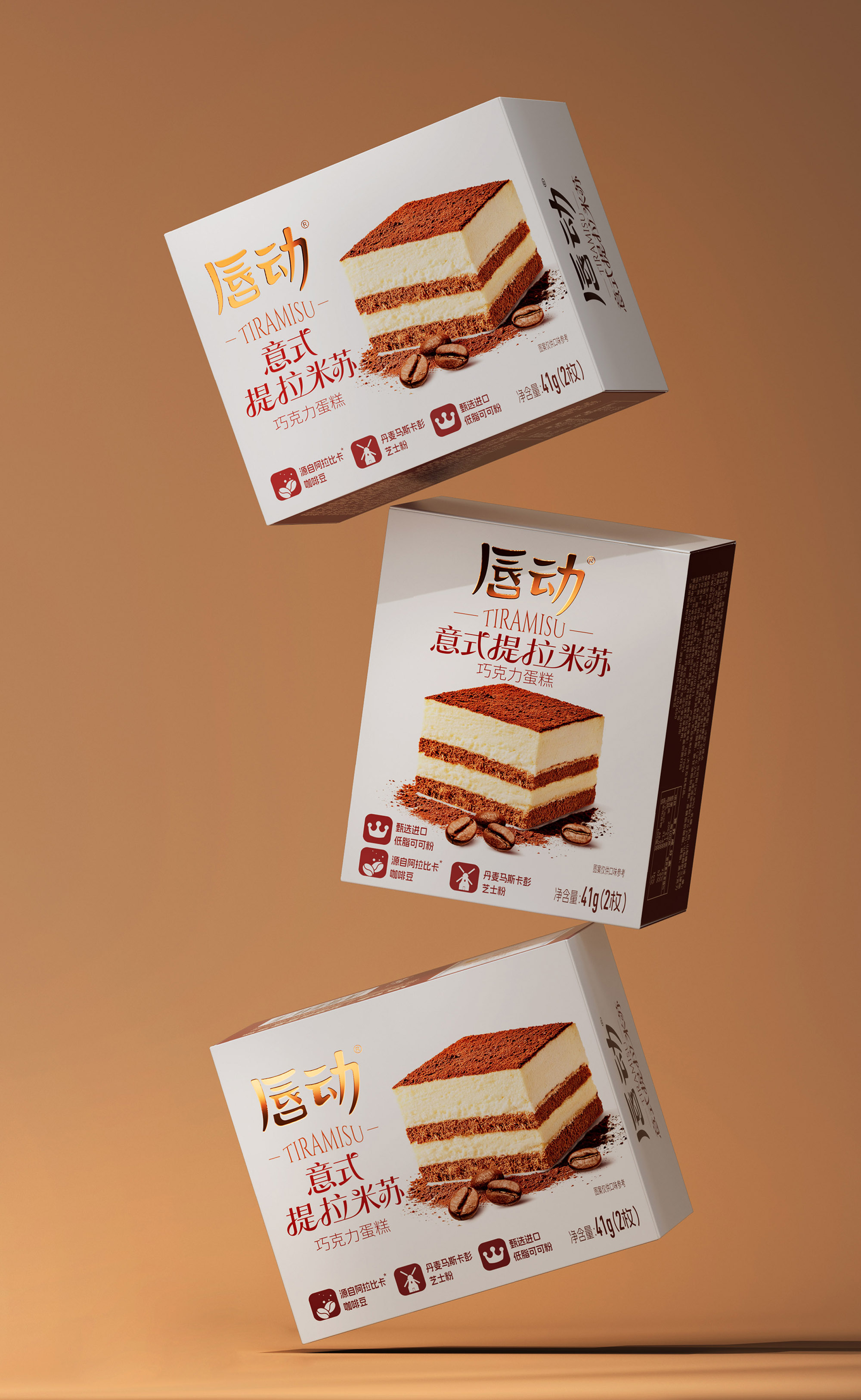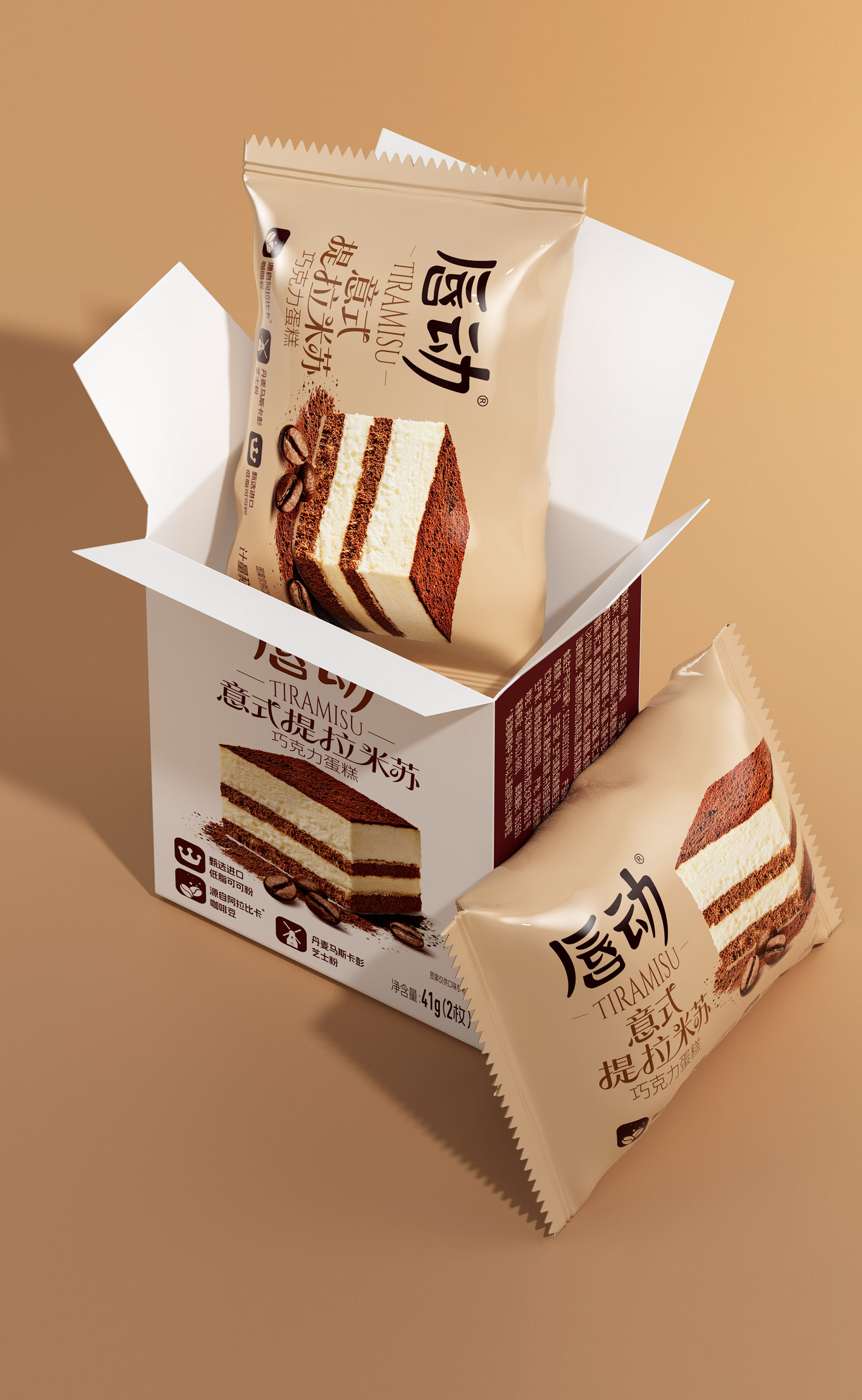 放大蛋糕实物图,清晰展示分层结构(乳白糕体 + 可可夹层 + 可可粉顶),搭配散落的咖啡豆与可可粉细节,还原提拉米苏的绵密质感;暖棕色调与食物本身的醇厚色彩呼应,直观激发味蕾联想。抛弃繁杂的无效信息,让包装成为 “畅销 + 优质” 的信任载体和食品包装大品牌大单品的信任背书。