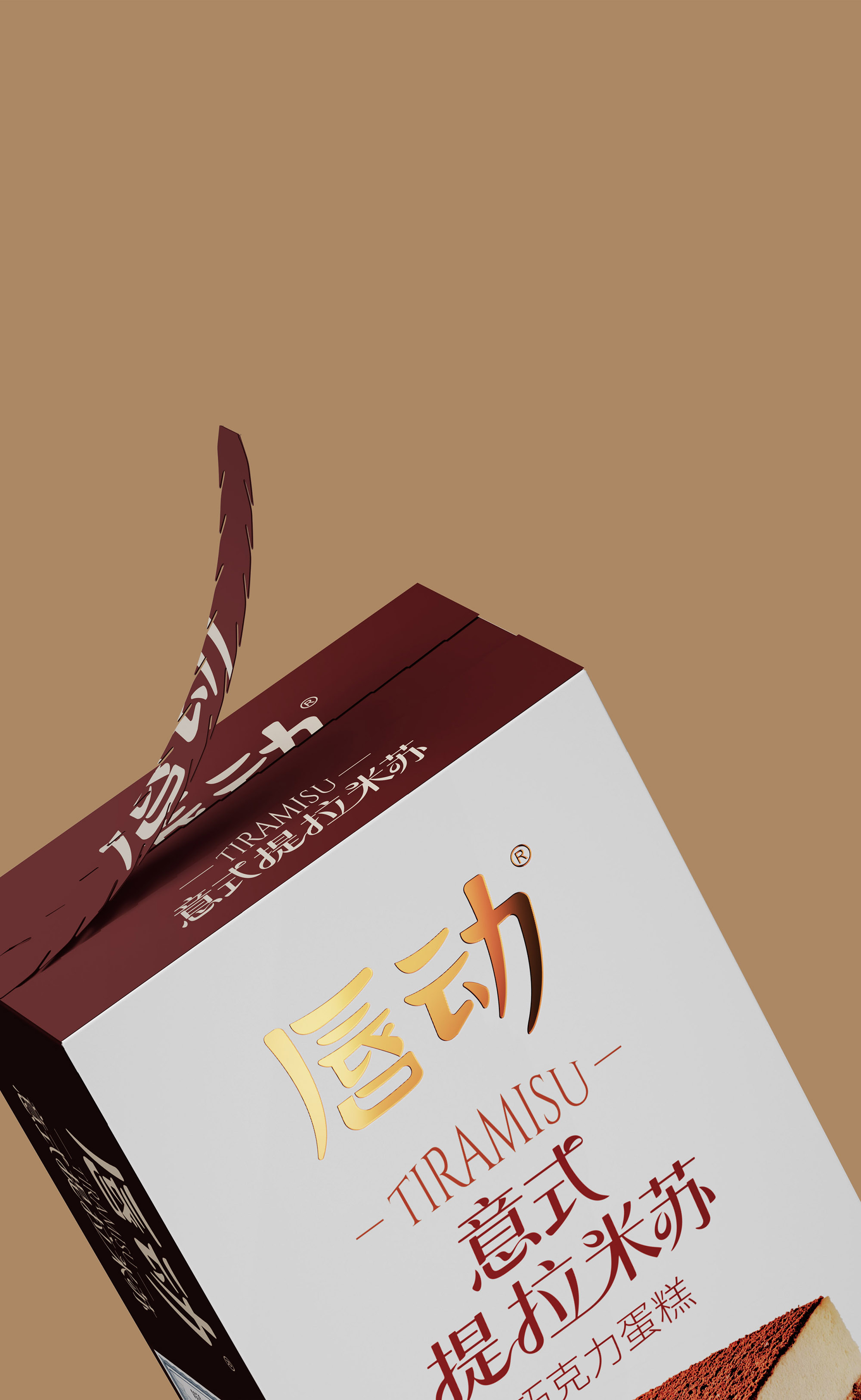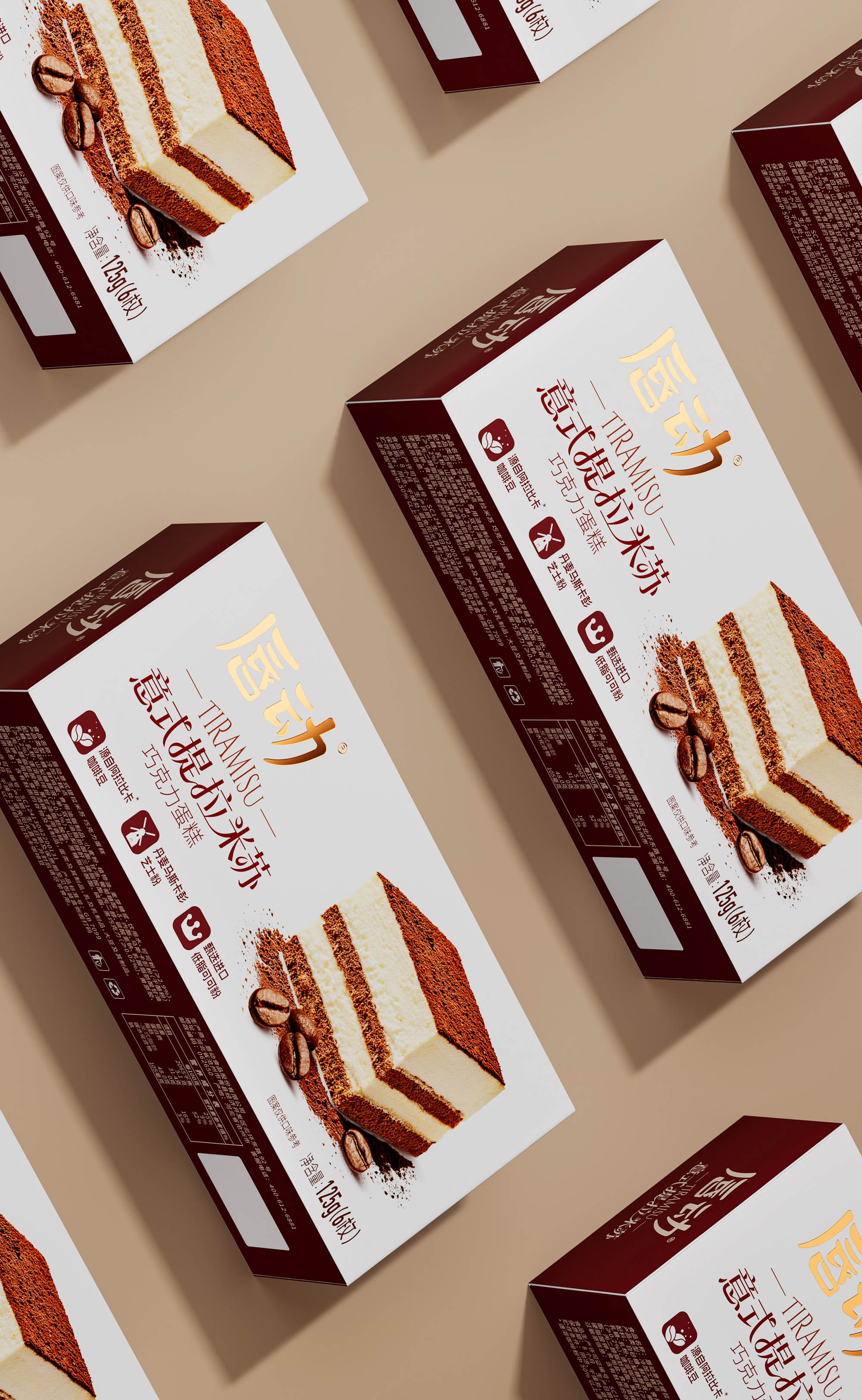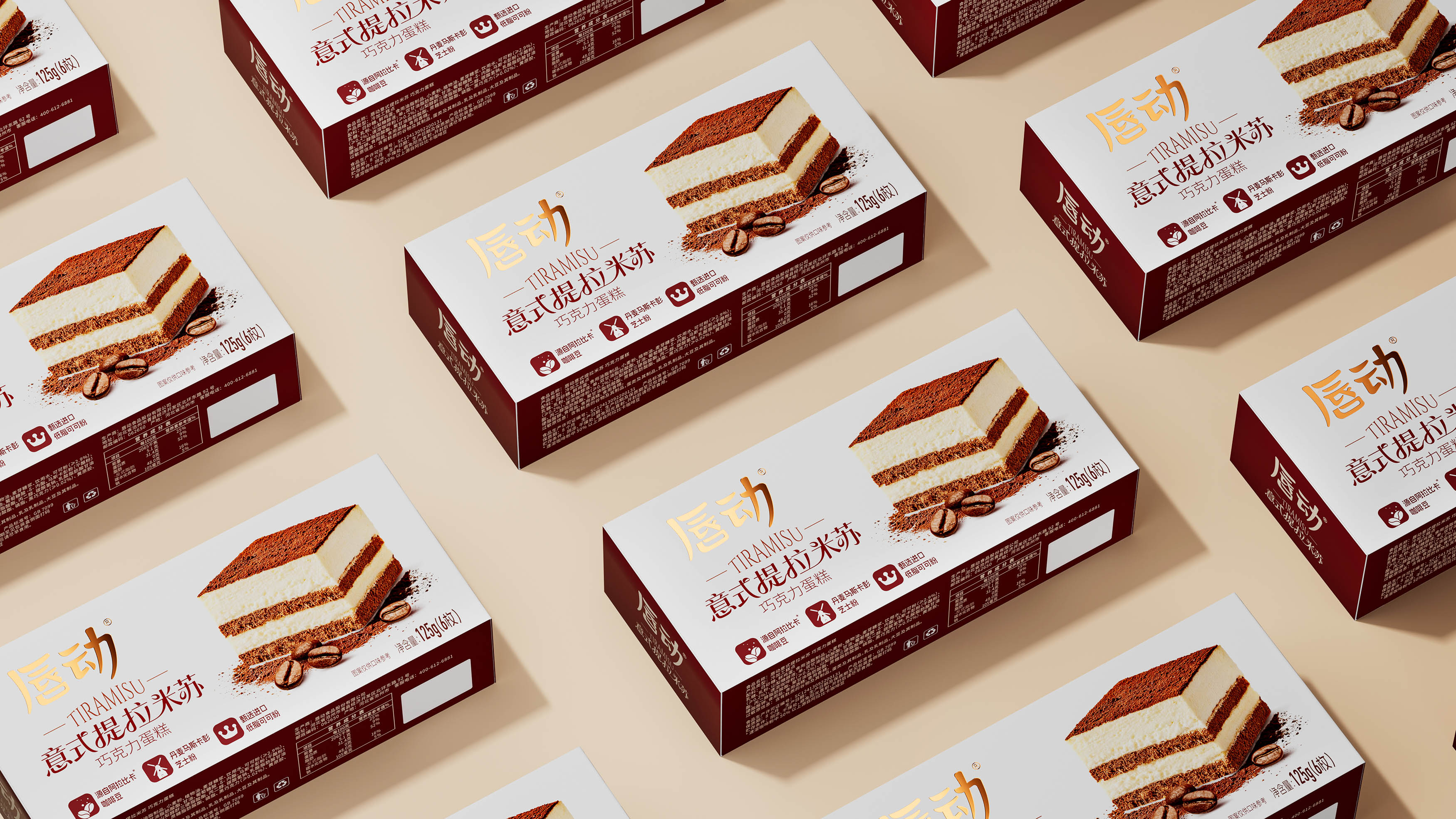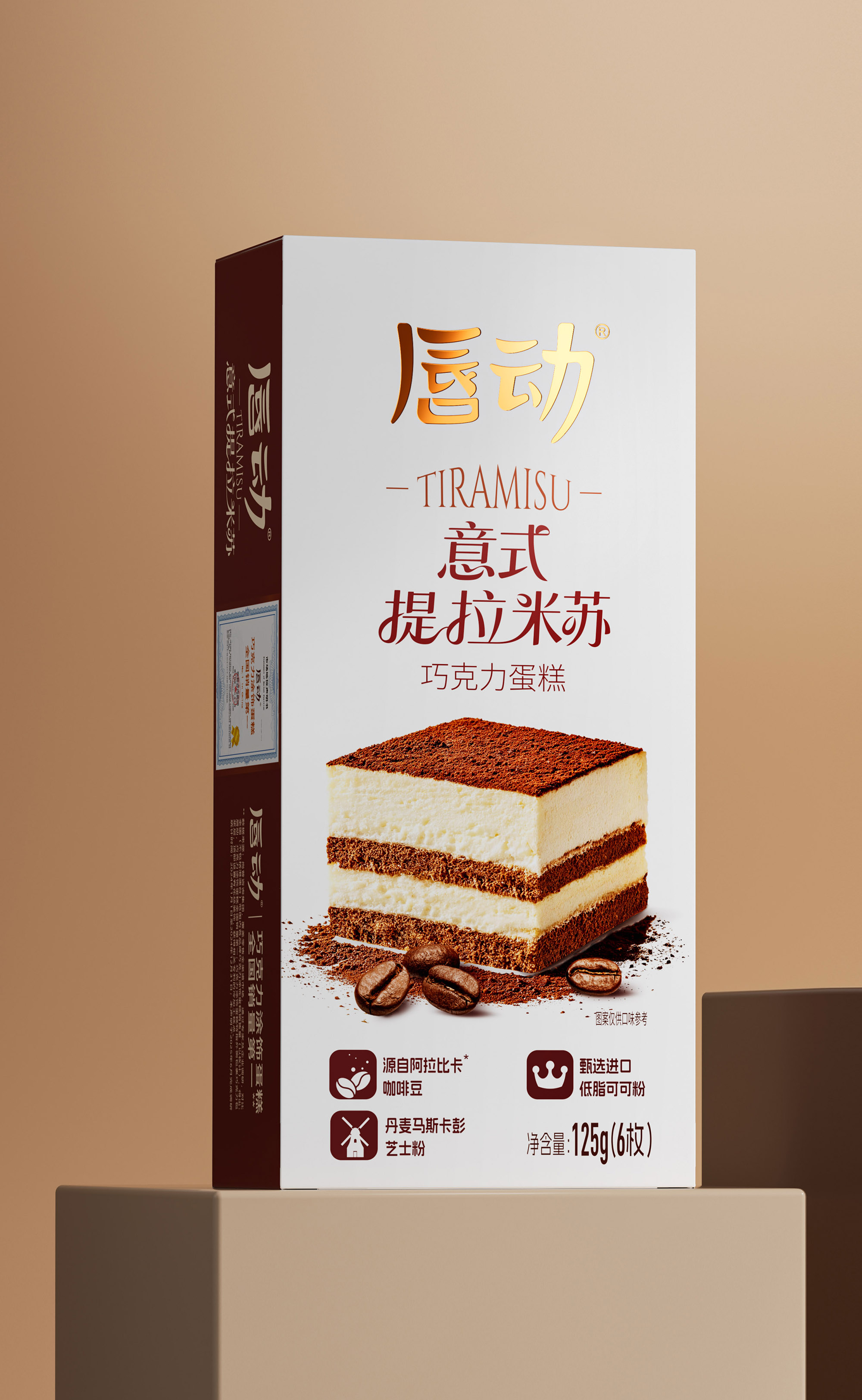 放大蛋糕实物图,清晰展示分层结构(乳白糕体 + 可可夹层 + 可可粉顶),搭配散落的咖啡豆与可可粉细节,还原提拉米苏的绵密质感;暖棕色调与食物本身的醇厚色彩呼应,直观激发味蕾联想。抛弃繁杂的无效信息,让包装成为 “畅销 + 优质” 的信任载体和食品包装大品牌大单品的信任背书。