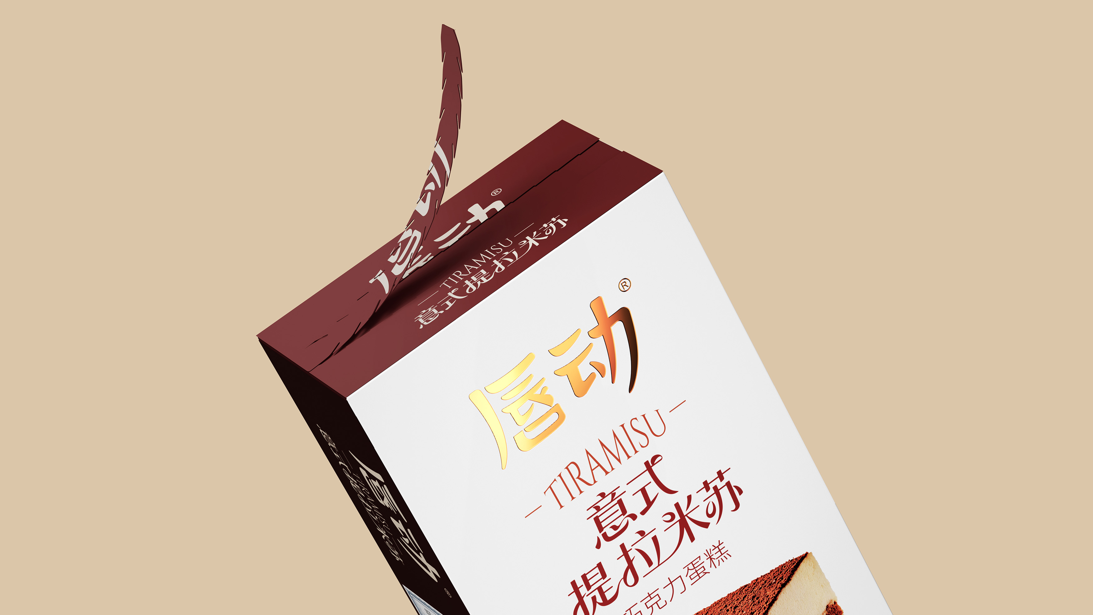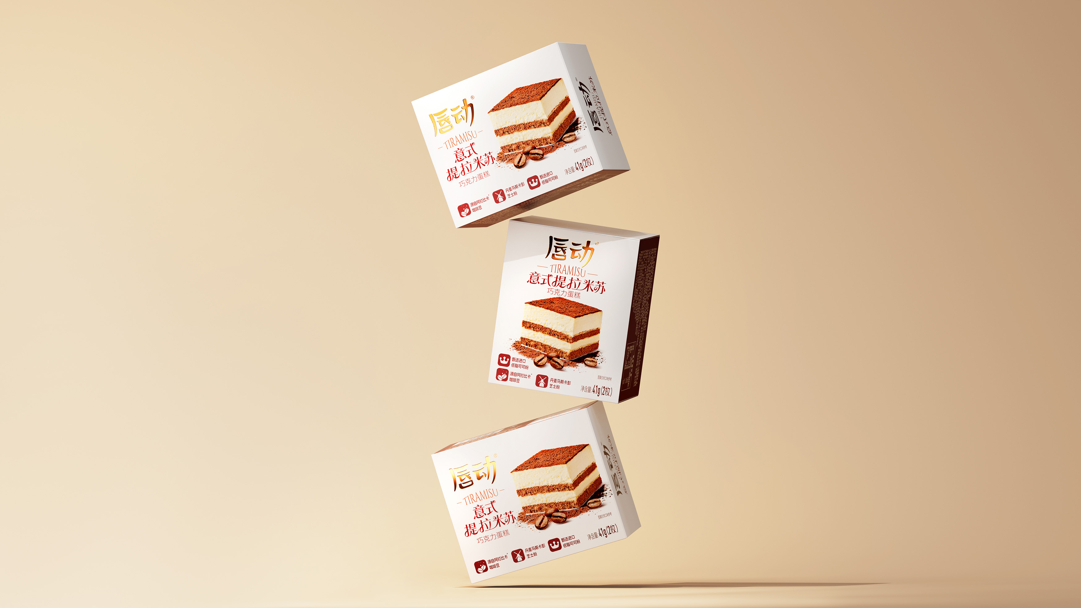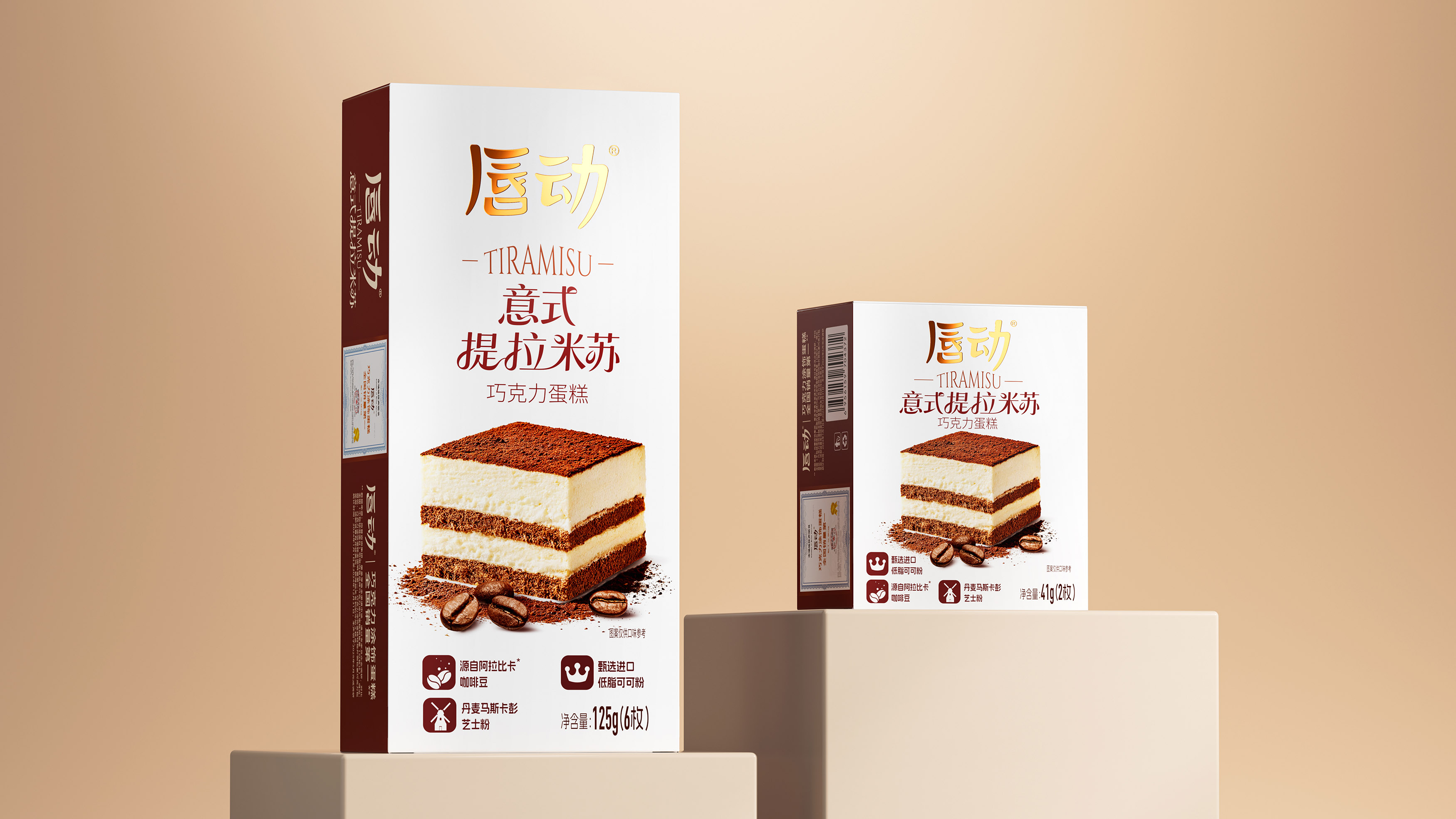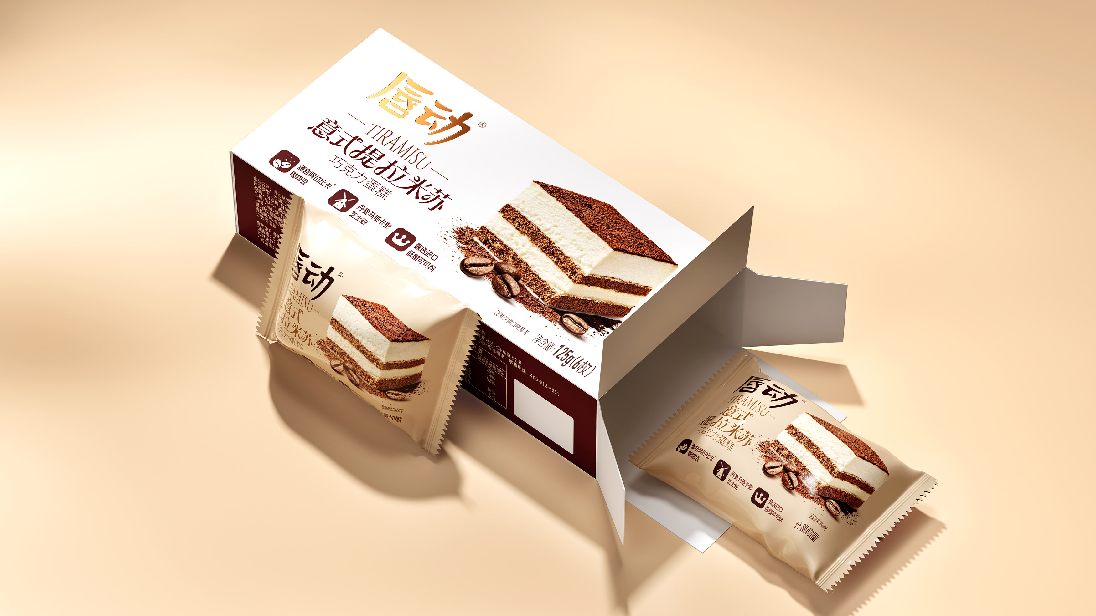 放大蛋糕实物图,清晰展示分层结构(乳白糕体 + 可可夹层 + 可可粉顶),搭配散落的咖啡豆与可可粉细节,还原提拉米苏的绵密质感;暖棕色调与食物本身的醇厚色彩呼应,直观激发味蕾联想。抛弃繁杂的无效信息,让包装成为 “畅销 + 优质” 的信任载体和食品包装大品牌大单品的信任背书。