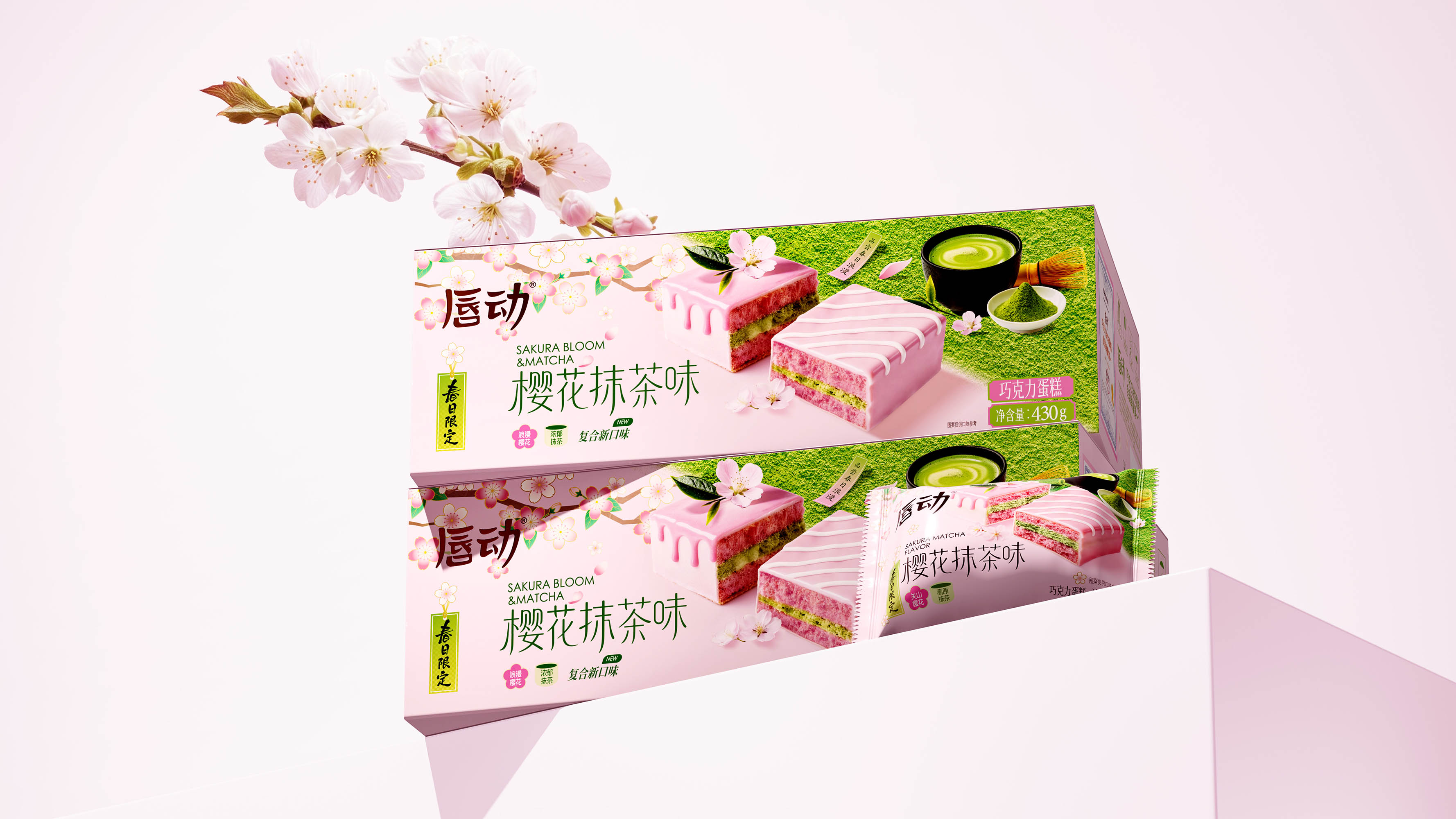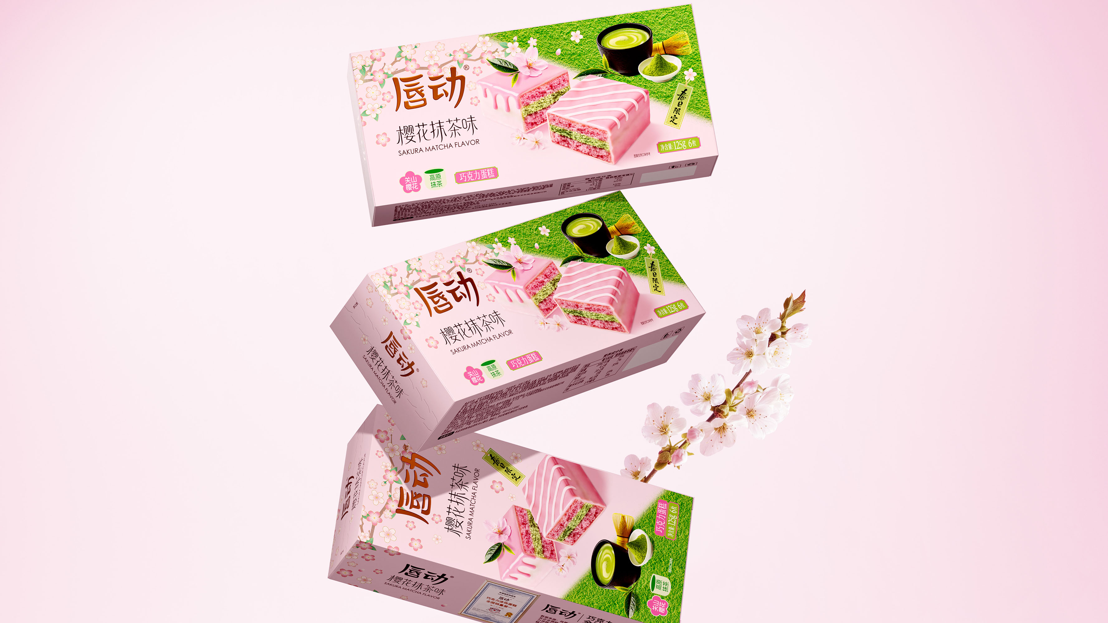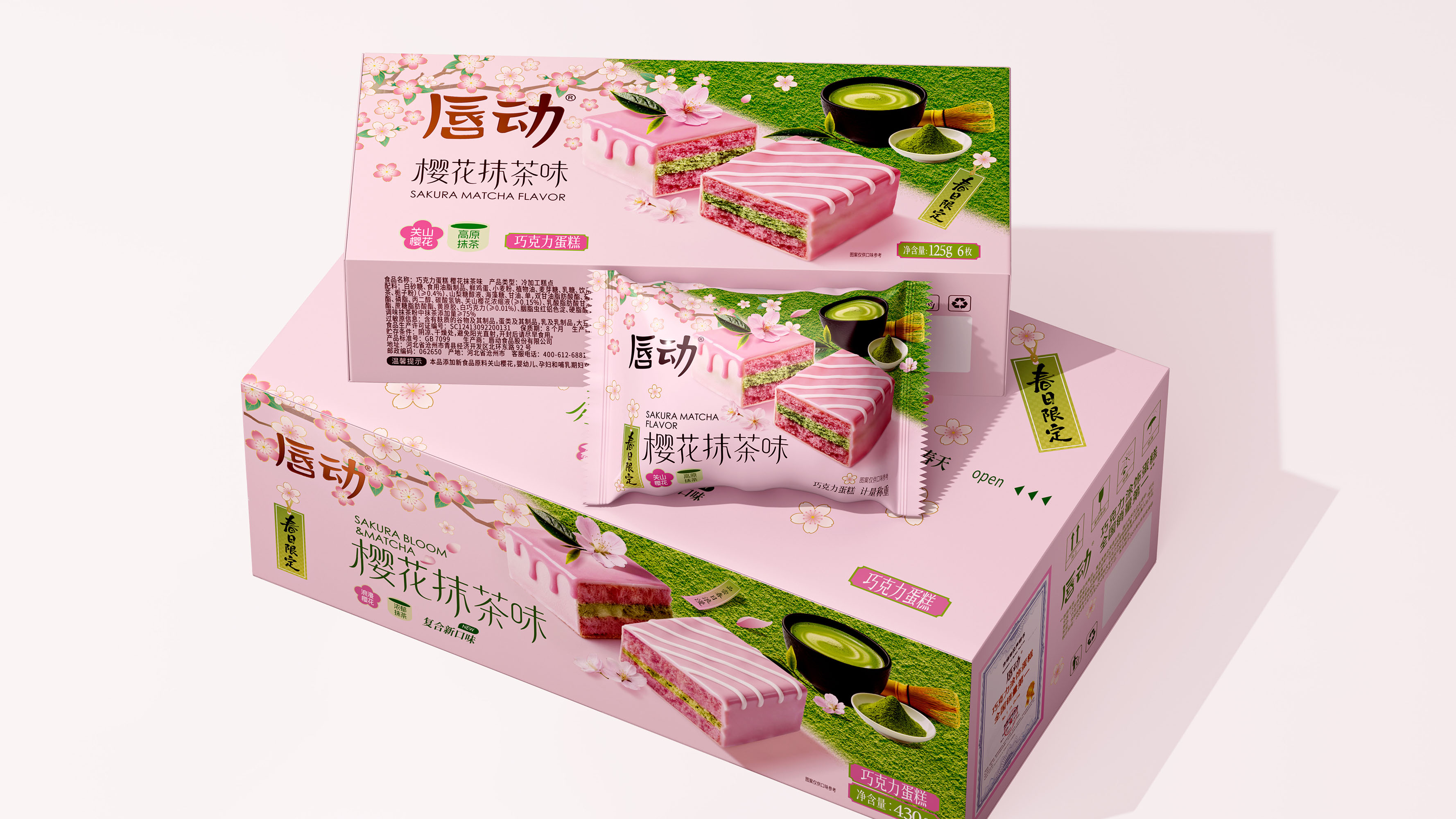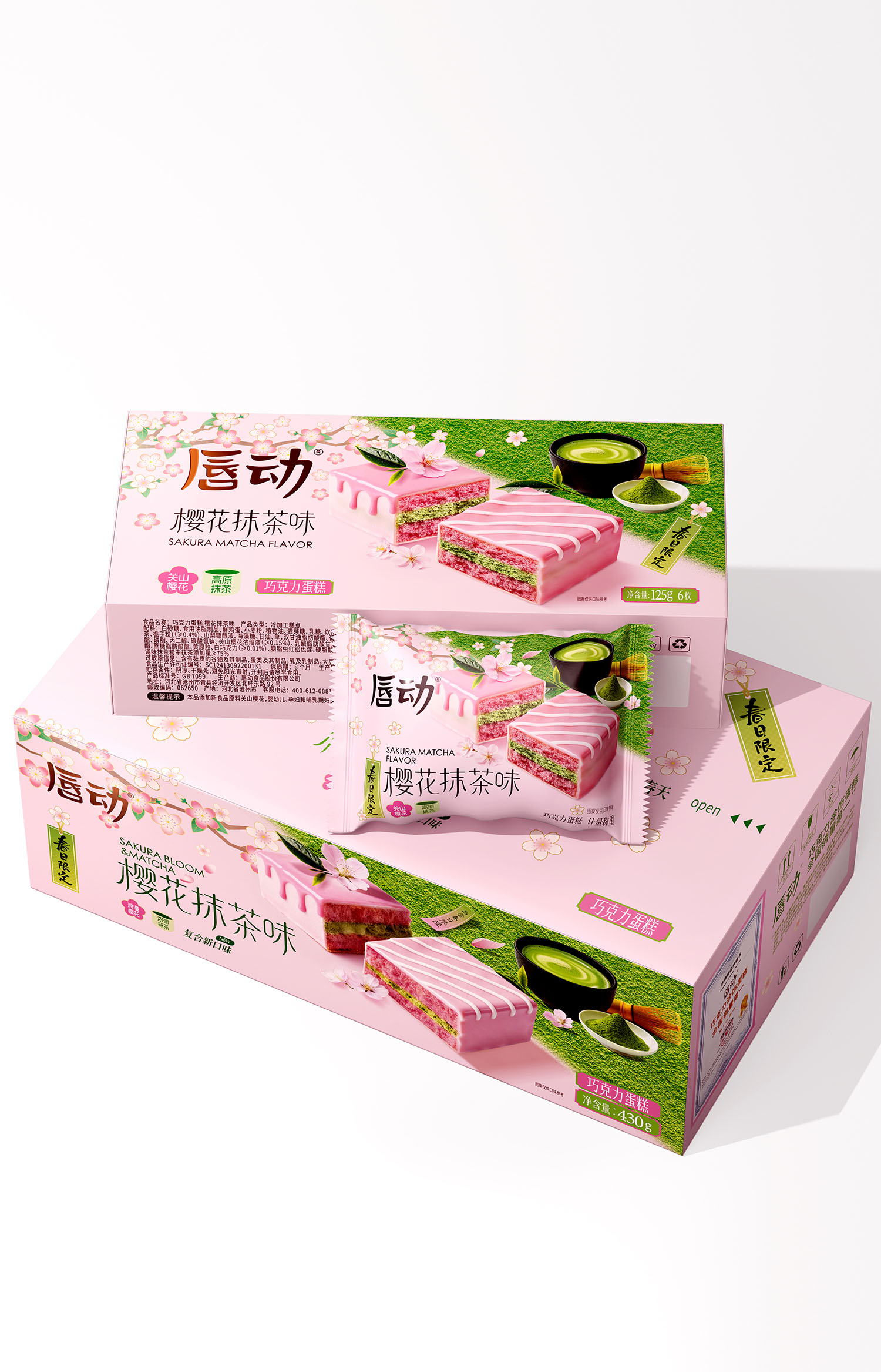 品尝一口春天浪漫 —— 唇动樱花抹茶味蛋糕包装,以春天意象为创意原点,将樱花的柔粉与抹茶的鲜绿凝于盒面,让消费者在指尖触碰间,先一步邂逅春日诗意。