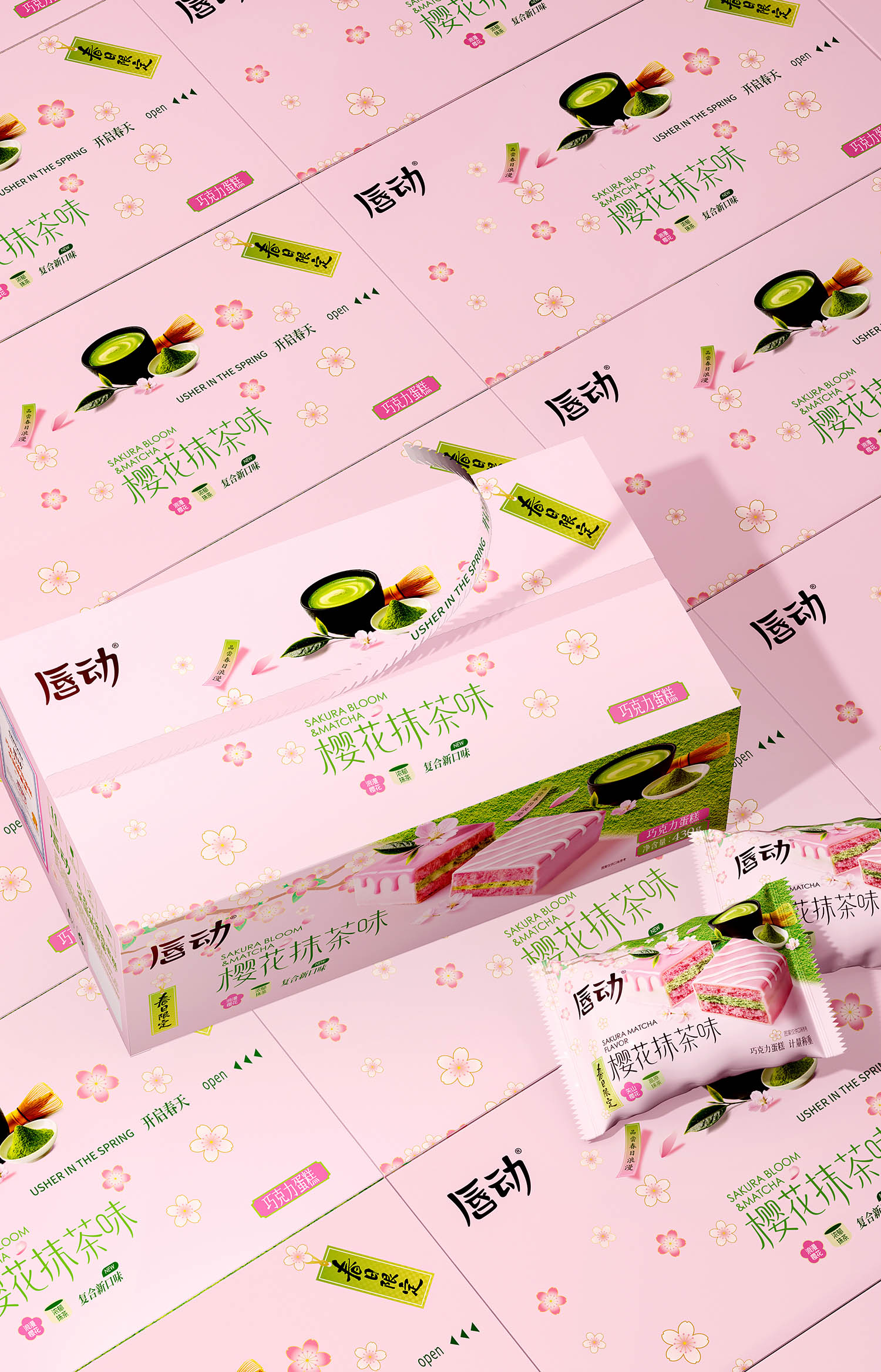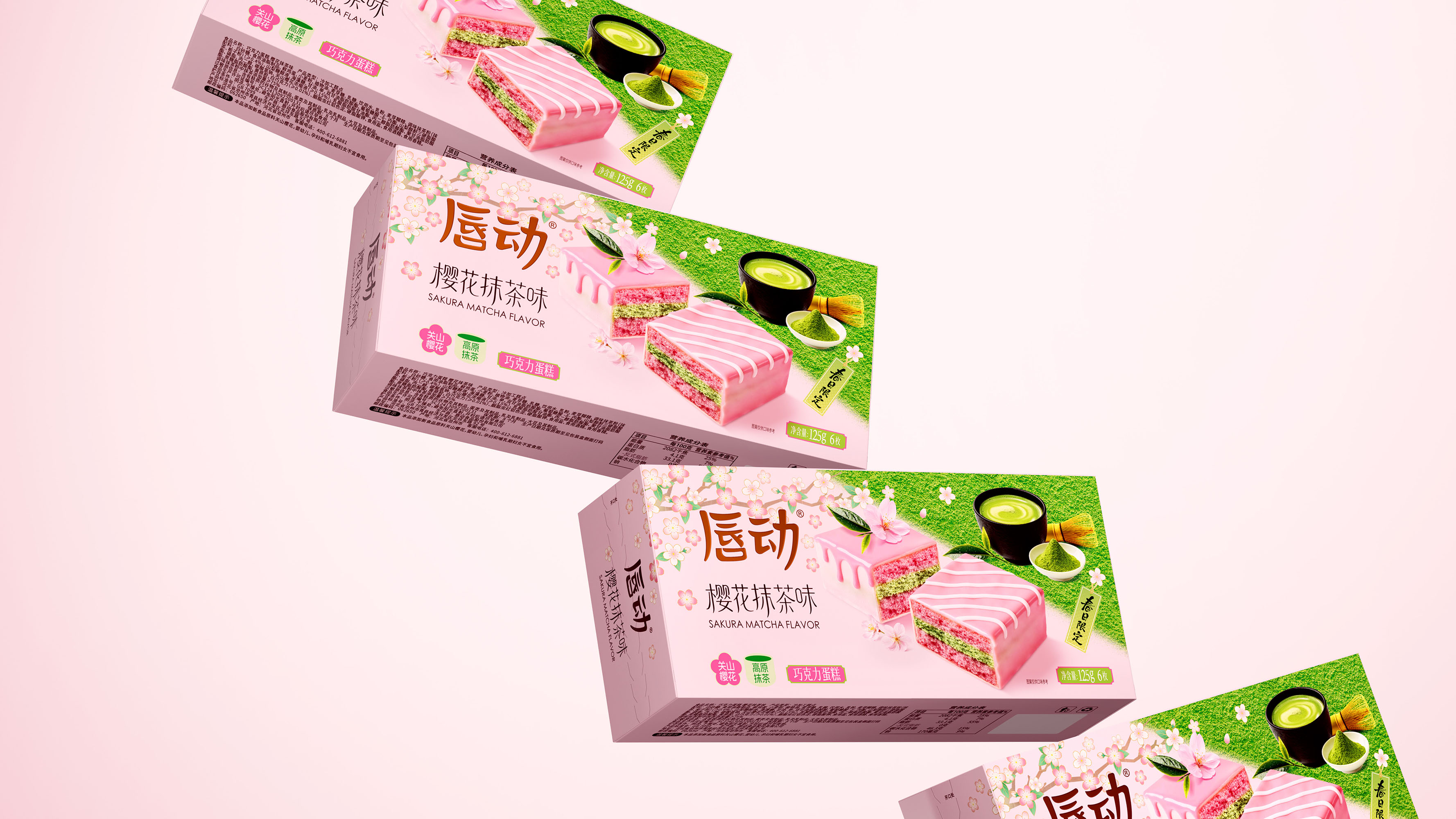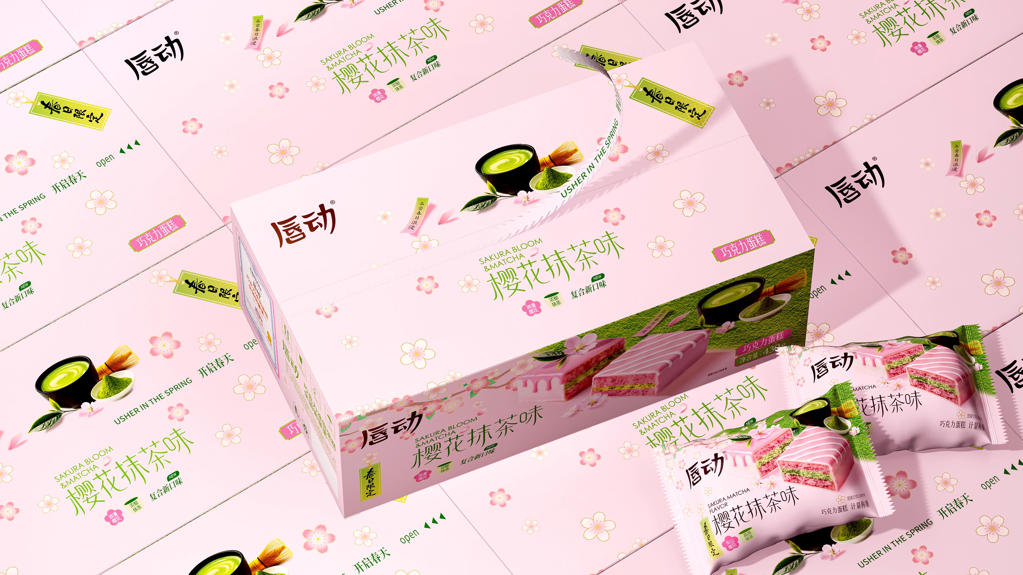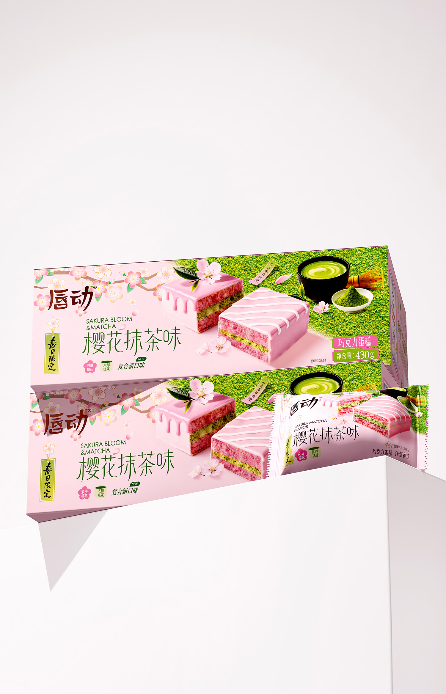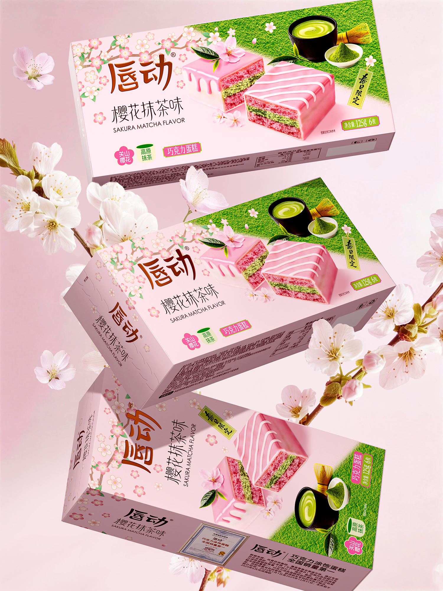 品尝一口春天浪漫 —— 唇动樱花抹茶味蛋糕包装,以春天意象为创意原点,将樱花的柔粉与抹茶的鲜绿凝于盒面,让消费者在指尖触碰间,先一步邂逅春日诗意。