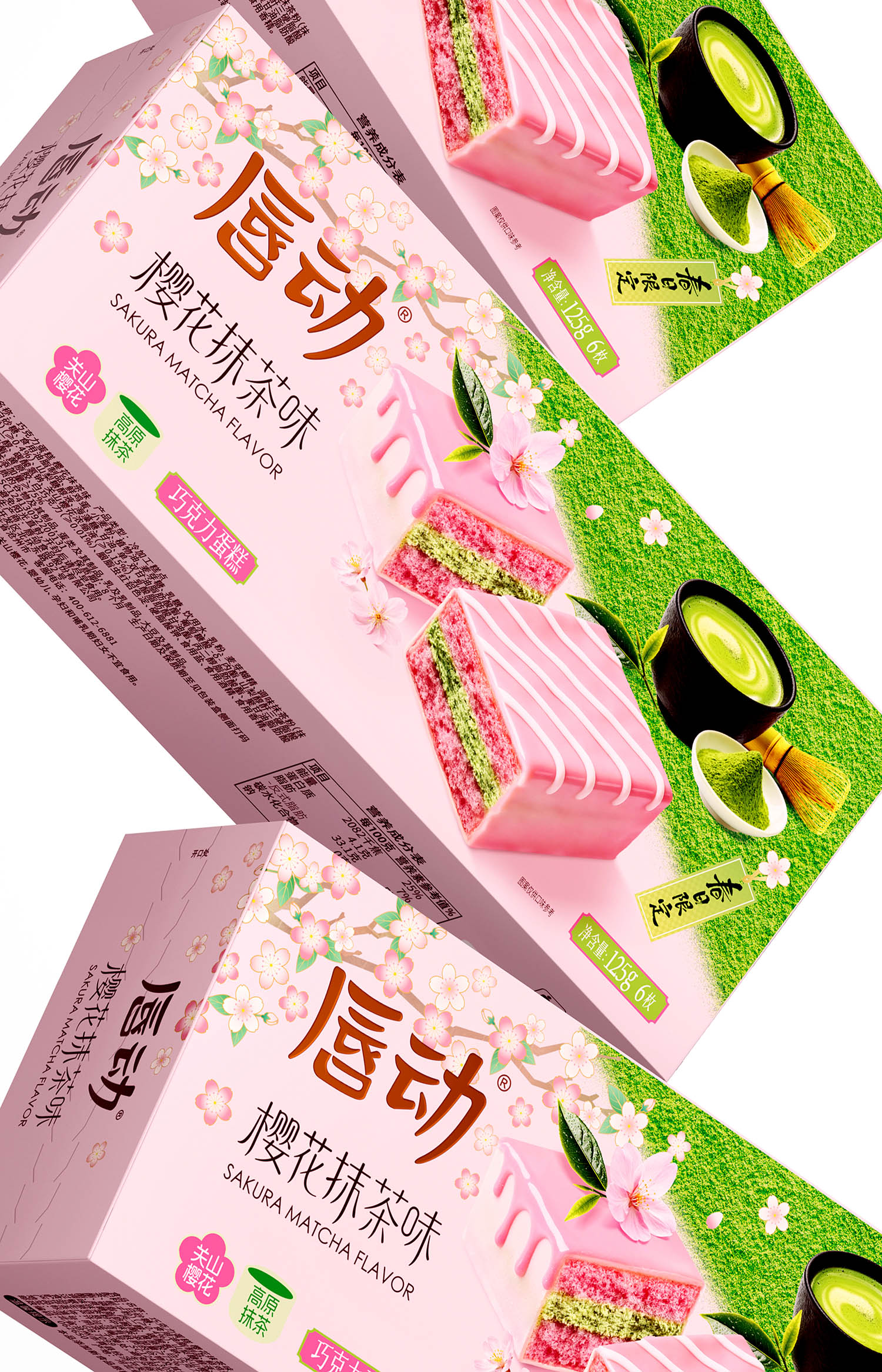 设计呈现上,以樱花粉 + 抹茶绿为核心视觉色,柔粉呼应关山樱花的烂漫,鲜绿还原高原抹茶的清新,层次分明的色彩碰撞,既传递出 “樱花落、抹茶生” 的春日时序感,也精准契合产品 “樱花 + 抹茶” 的风味内核。盒面点缀垂落樱花、抹茶器具与蛋糕切面,将 “咬一口春味” 的感官体验可视化,让浪漫意境与产品价值自然联结,唤醒消费者对春日仪式感的向往。