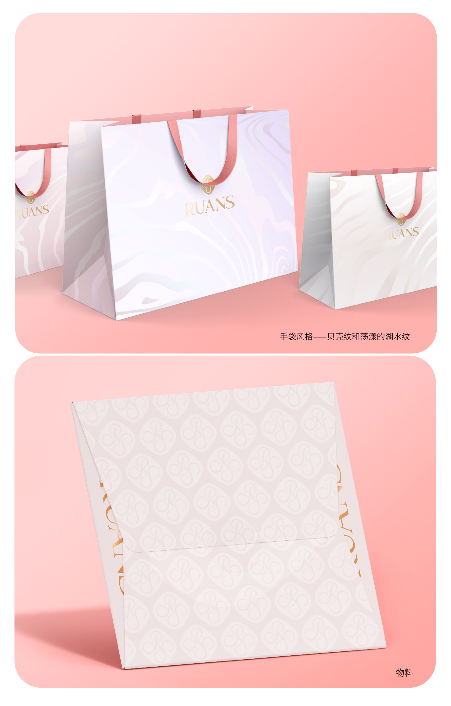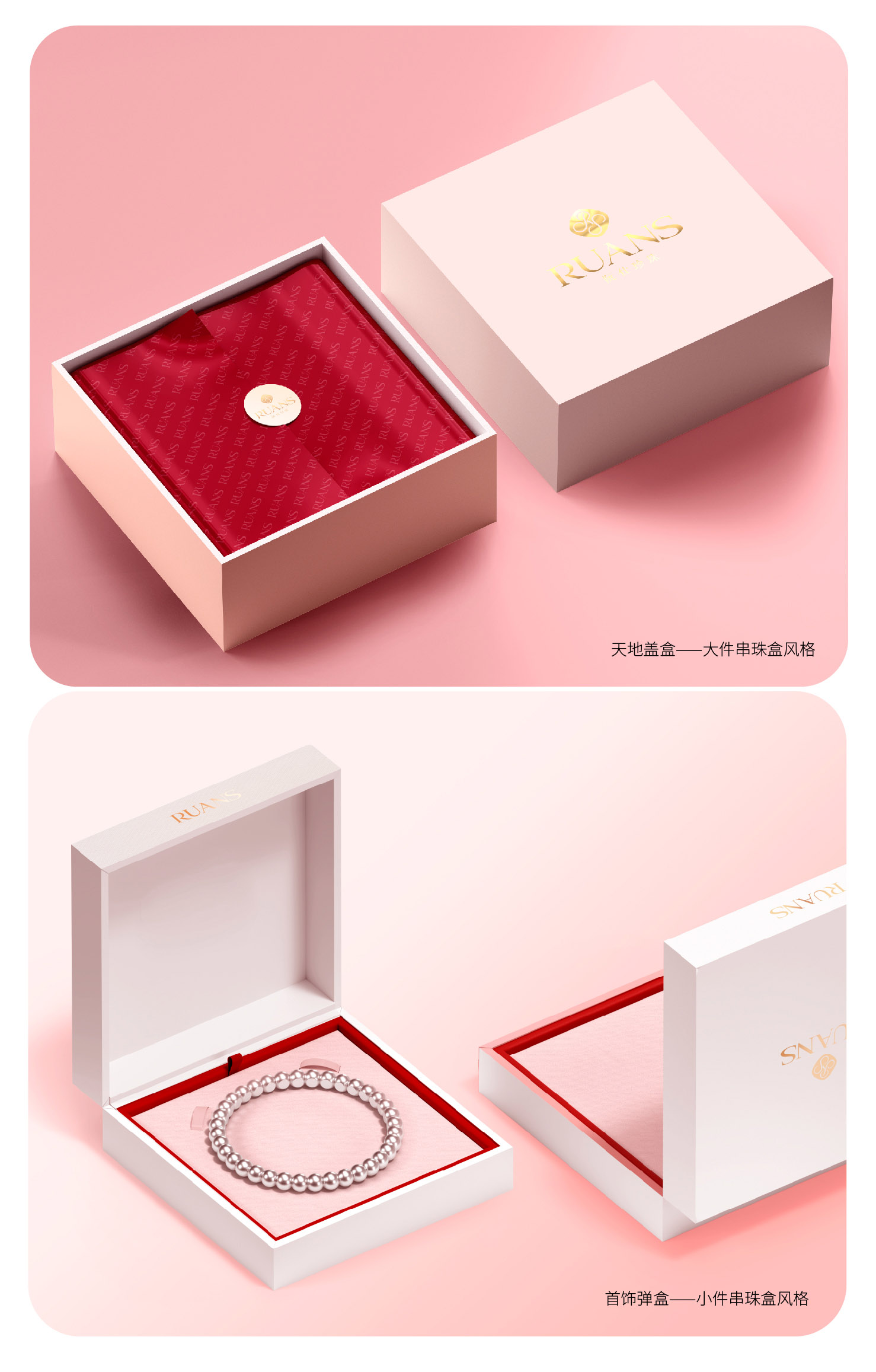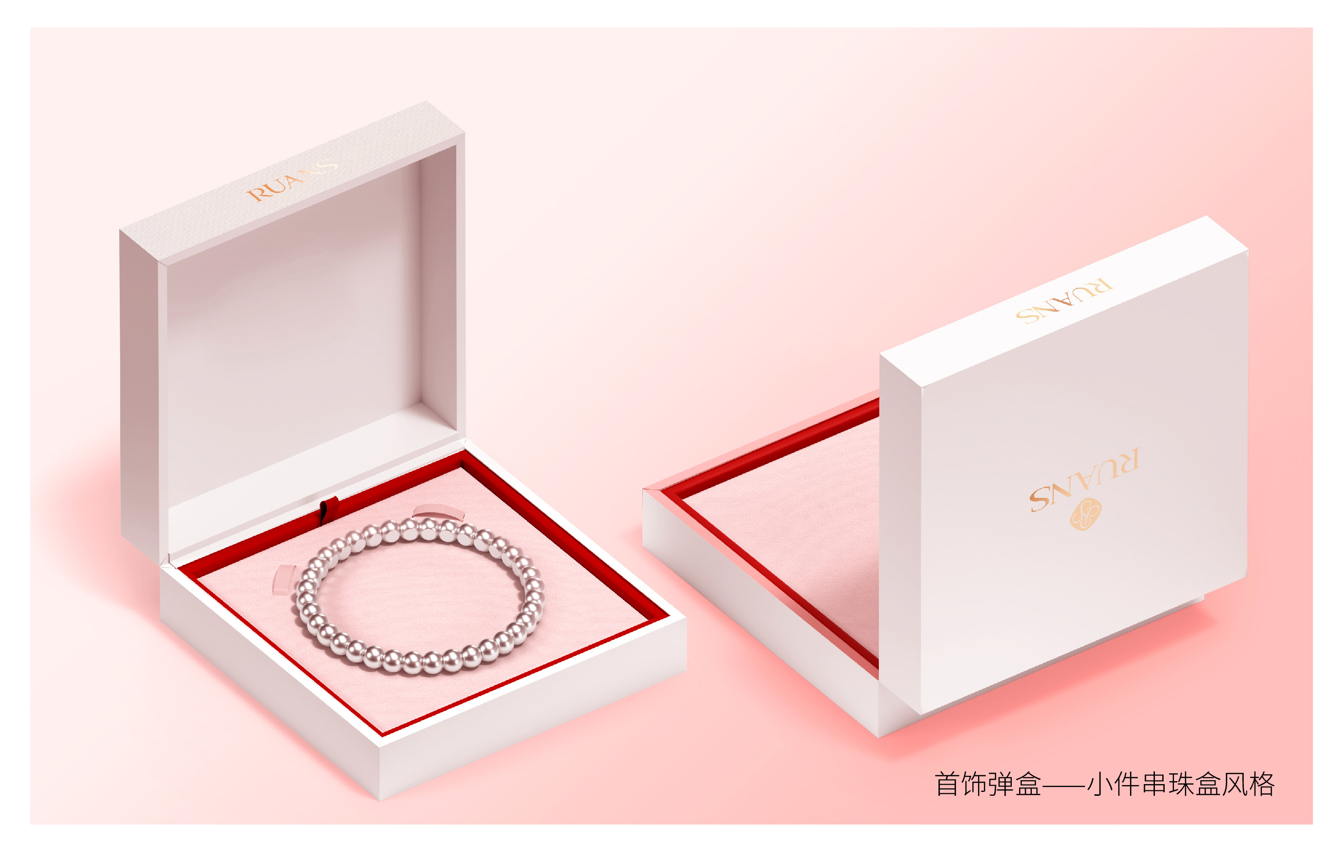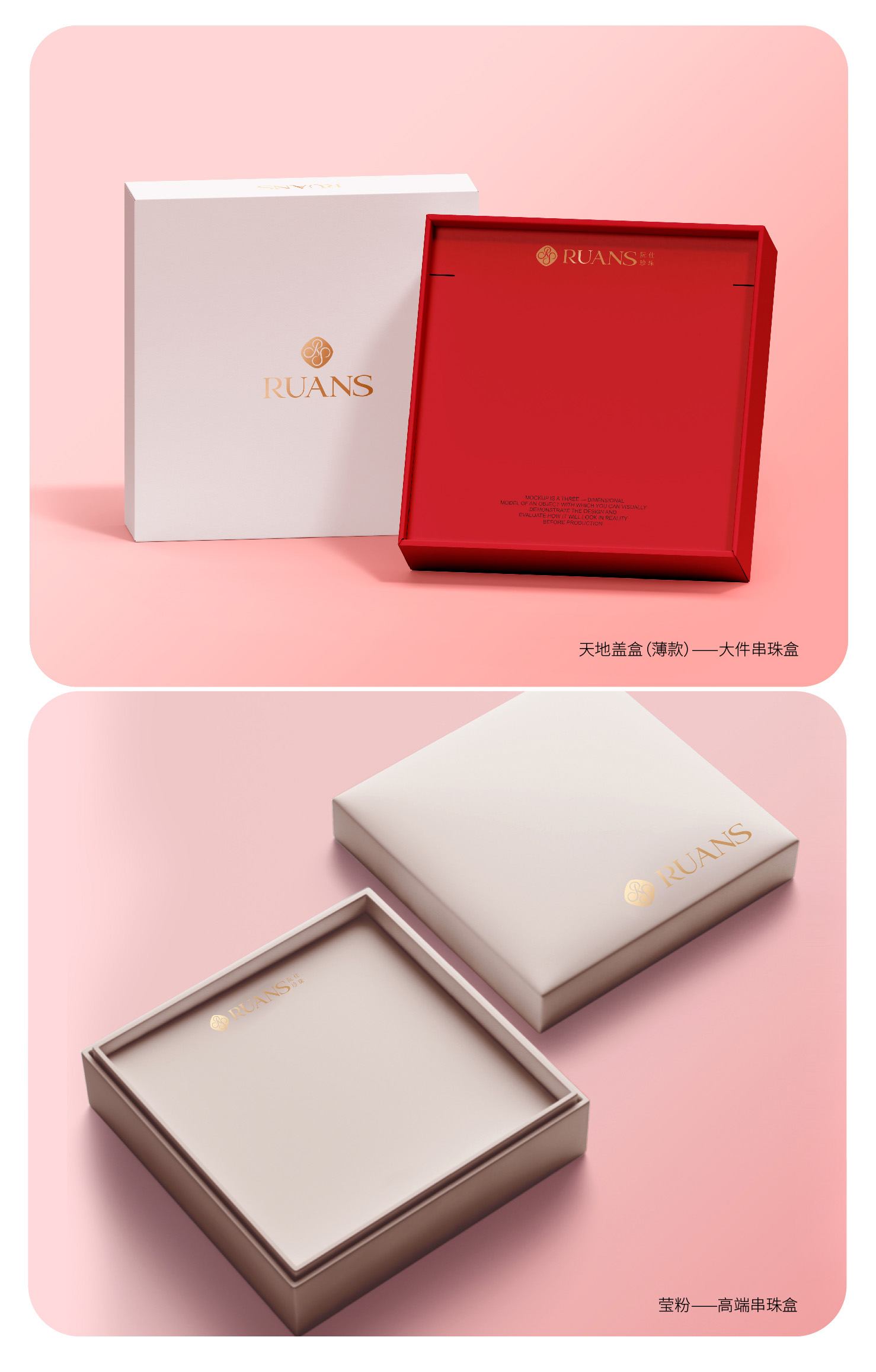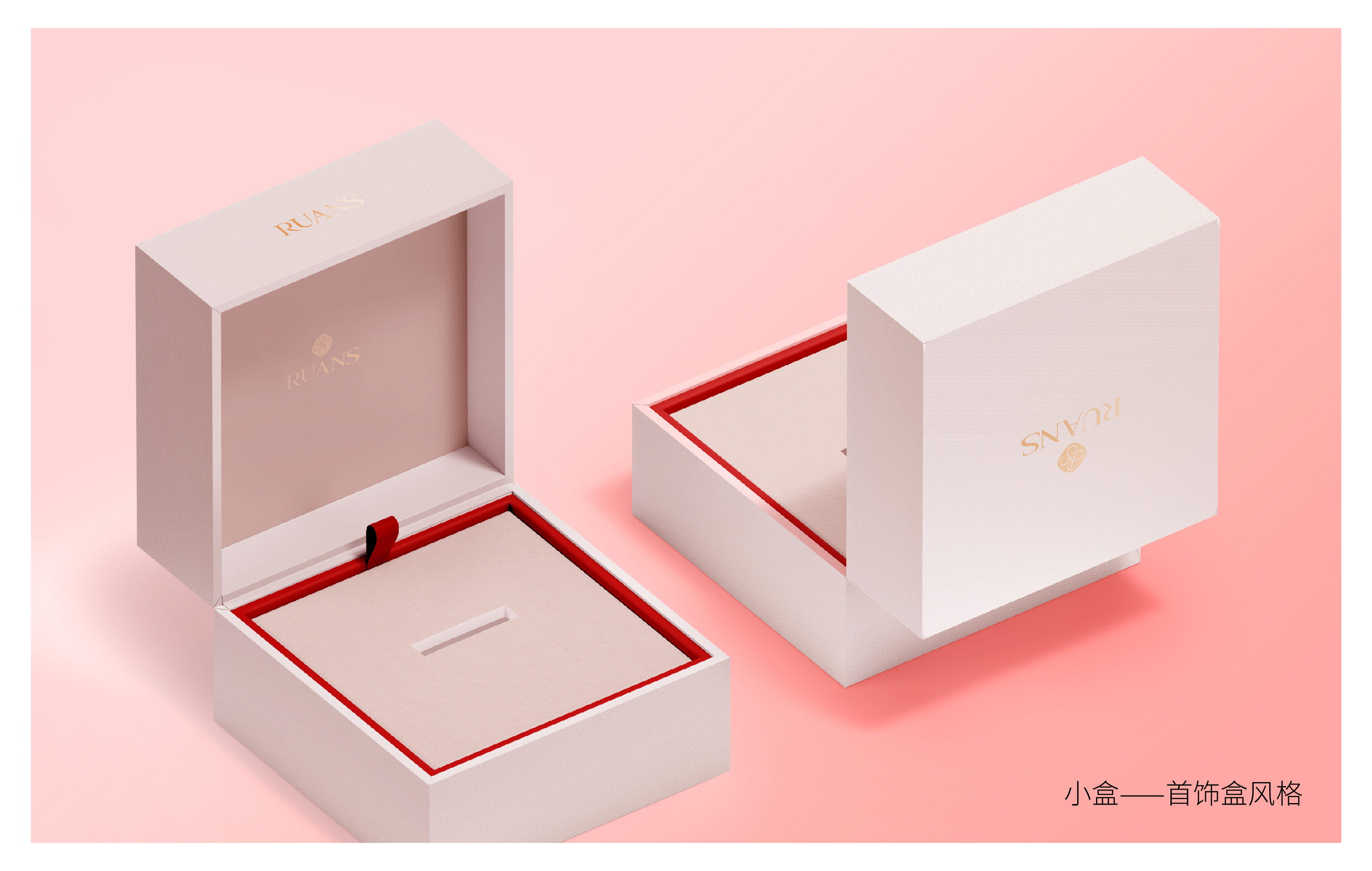 RUANS阮仕珍珠首饰盒凝练了品牌的优雅基因,以珍珠莹白、珍珠的柔粉为主色调,穿插品牌的的高贵红色,打造极具现代简洁的包装风格,将珍珠散发的自然光泽,通过珠光艺术纸的工艺呈现,将包装与产品与品牌完美的契合。