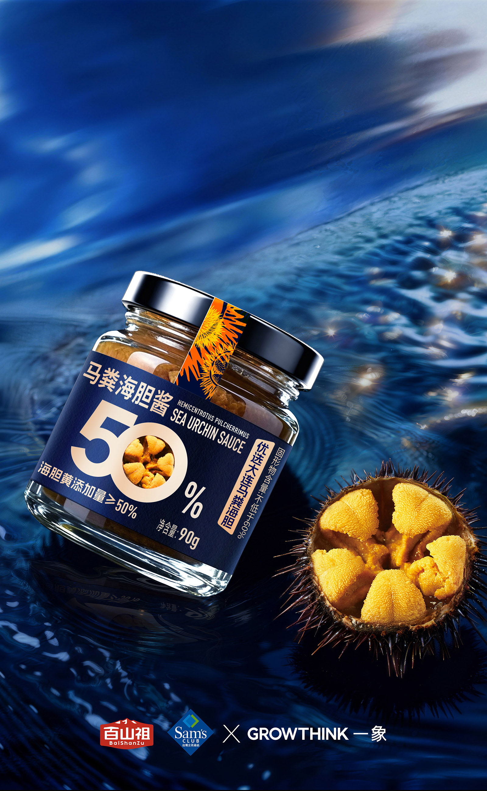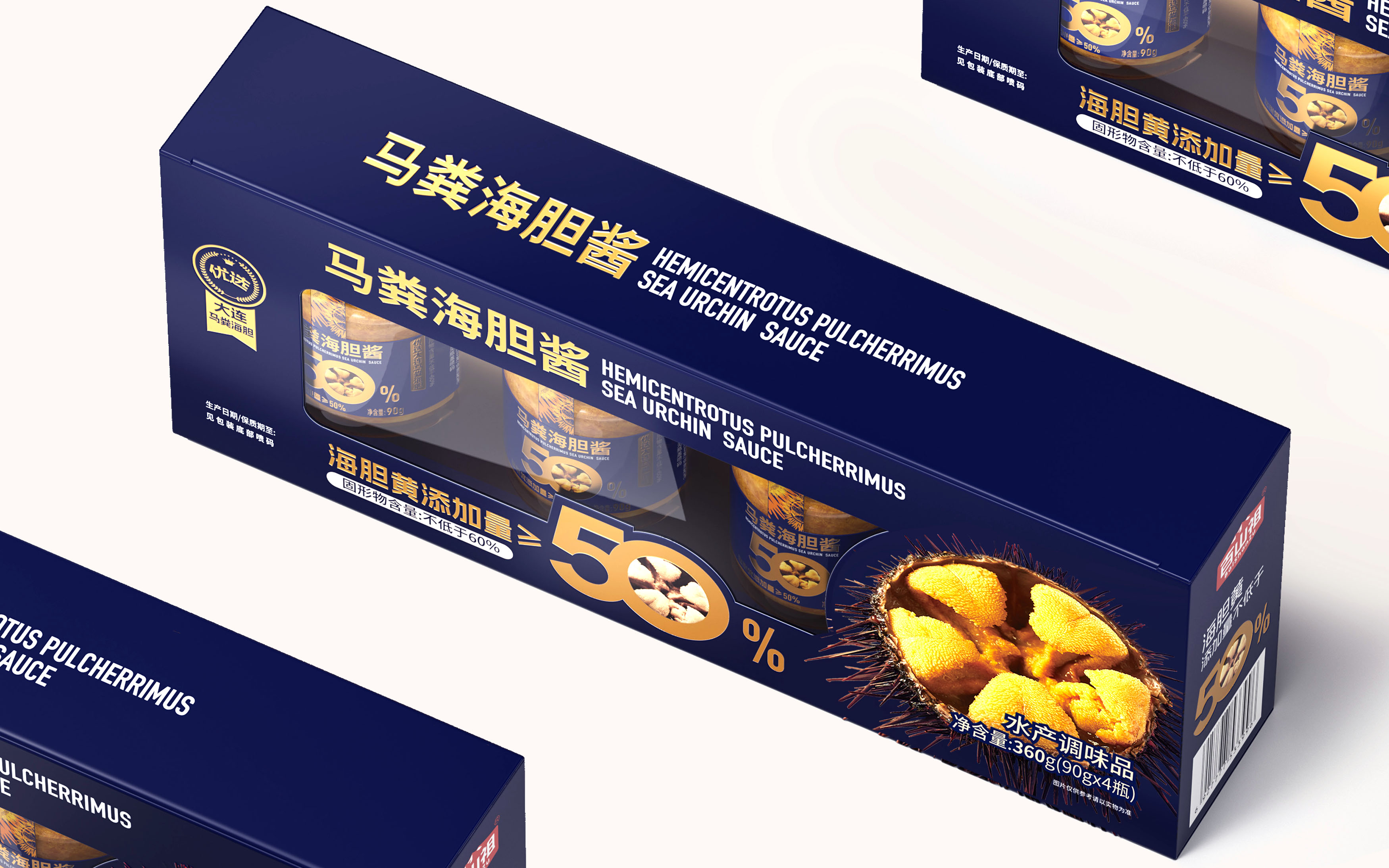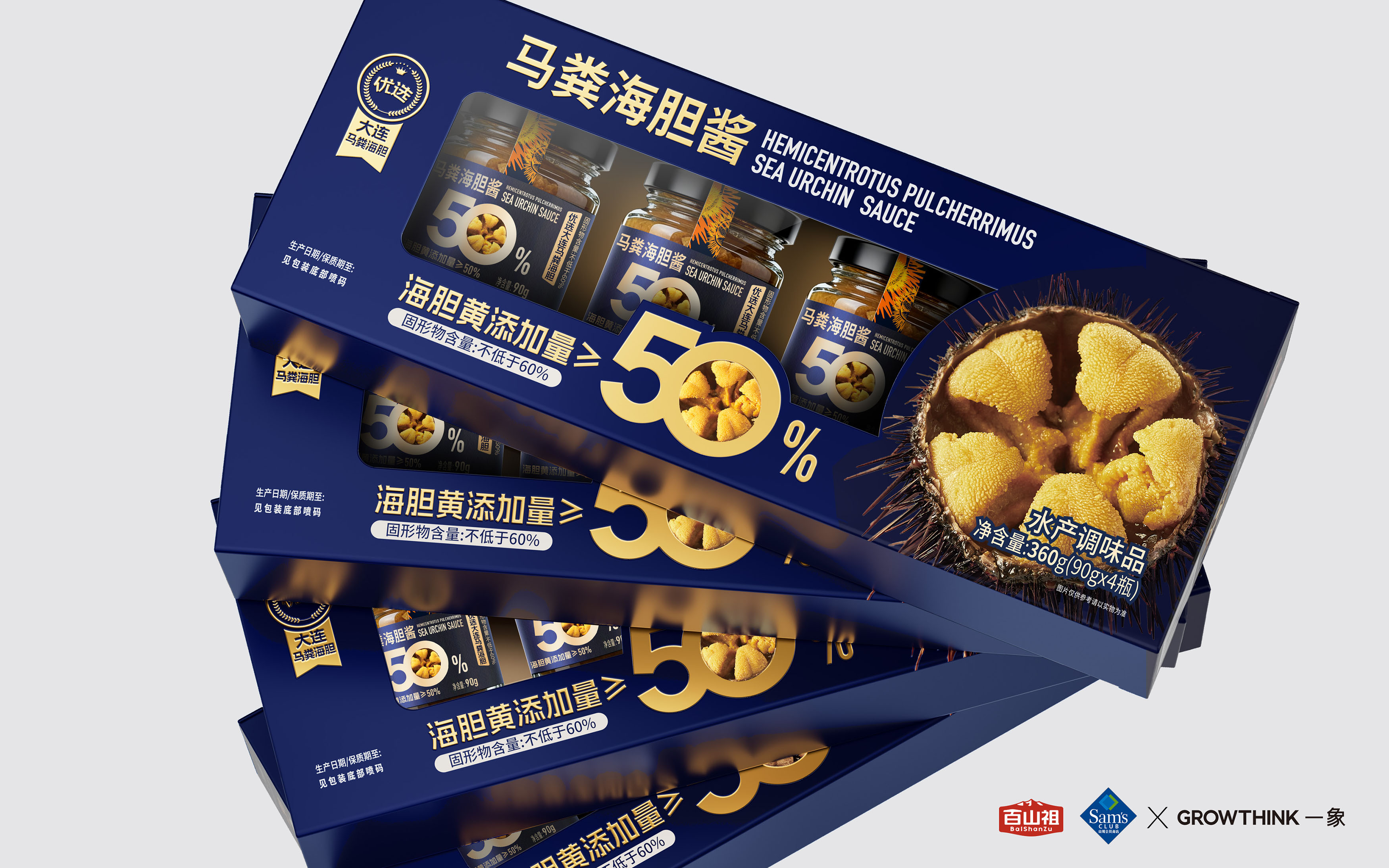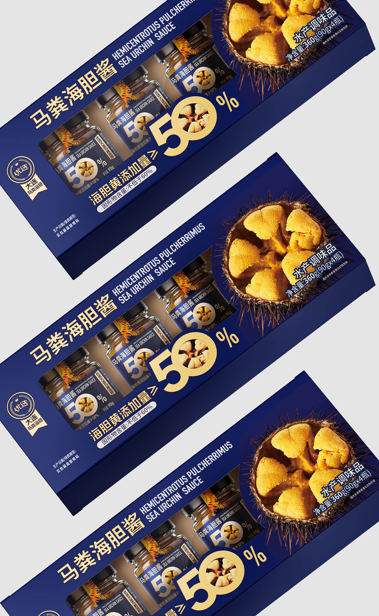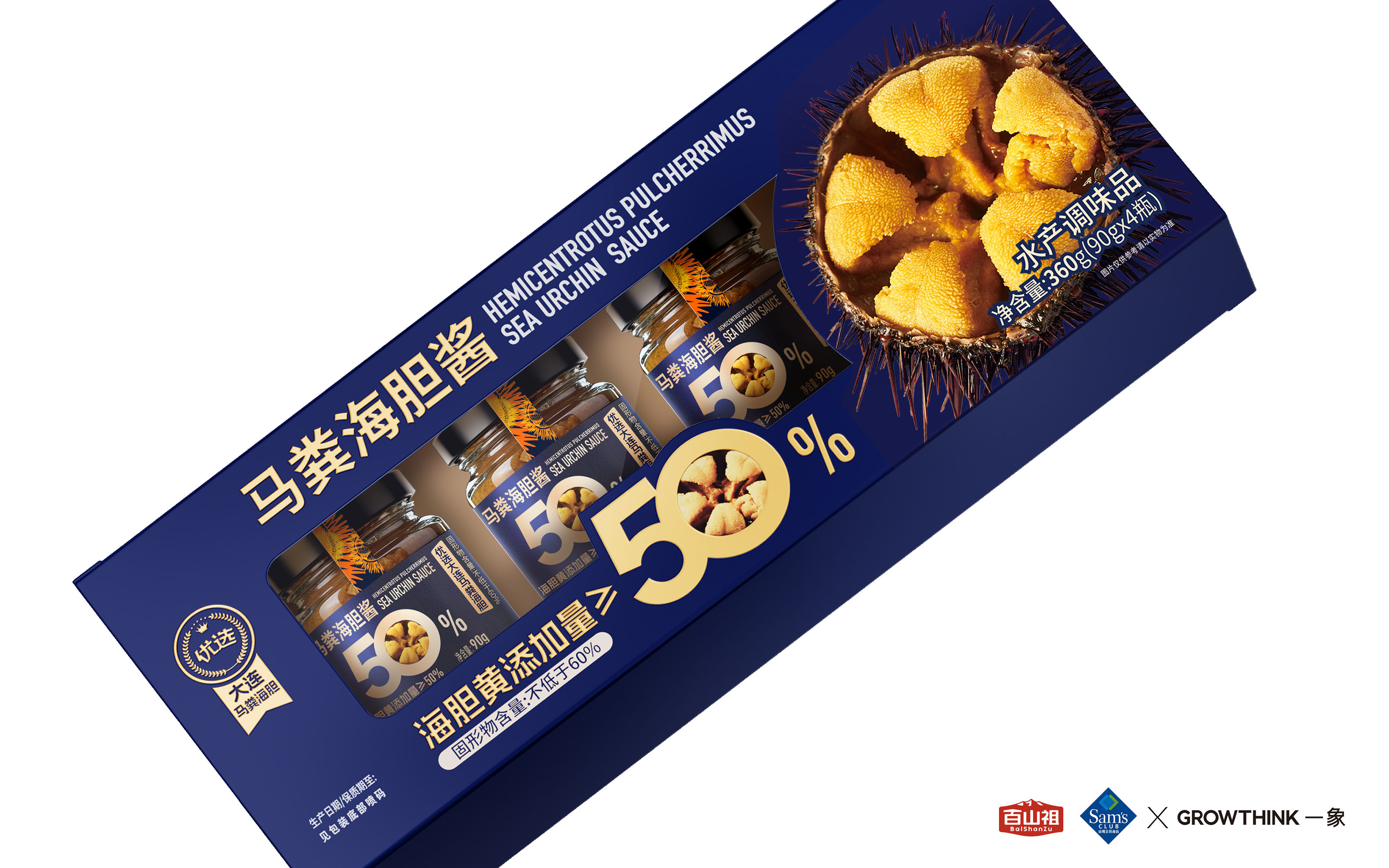 从视觉呈现上,采用深海蓝为主色调,既契合海胆的海洋属性,又传递出高端、纯净的质感。醒目的“海胆黄添加量≥50%”核心视觉点与海胆做强关联!让大家直接能换算出马粪海胆的价格,超值!以大比例字体和金色视觉符号强化,1秒抓住消费者对产品核心卖点的关注,满足山姆会员对品质与性价比的双重追求。同时,真实海胆黄的具象化展示,直观唤醒味蕾联想,将“鲜味放大”的产品定位通过视觉语言充分传达。即刻排除客户犹豫的货架售卖思维!