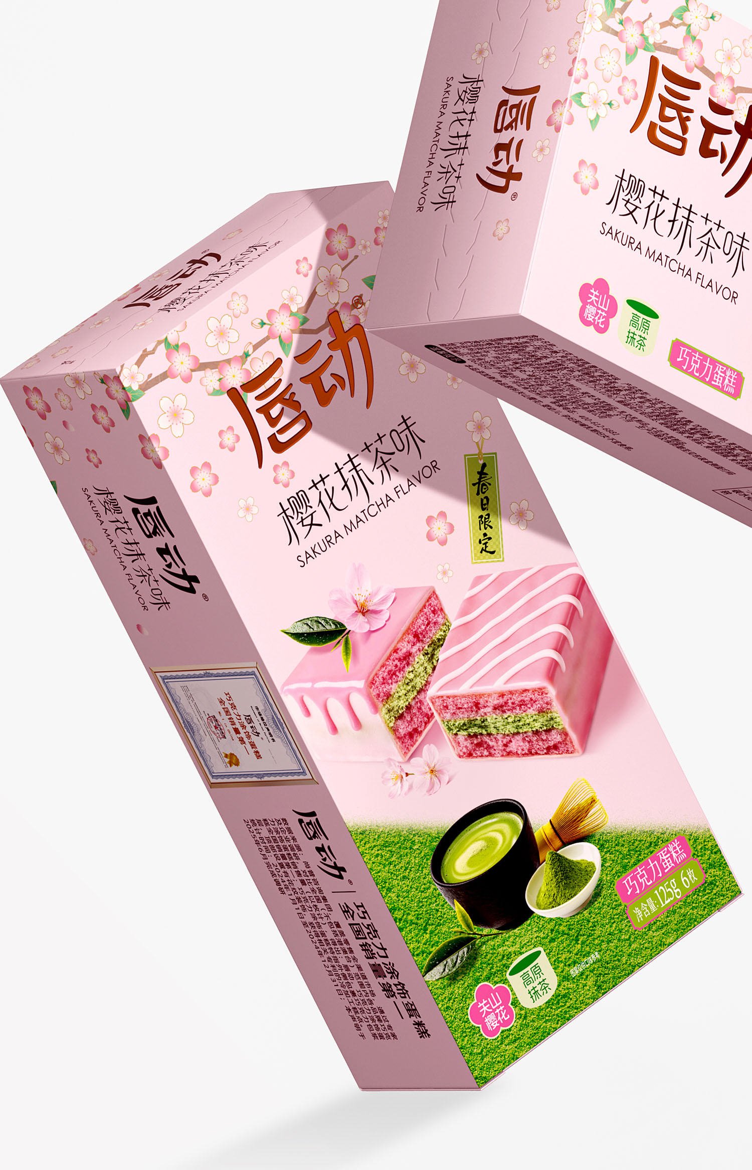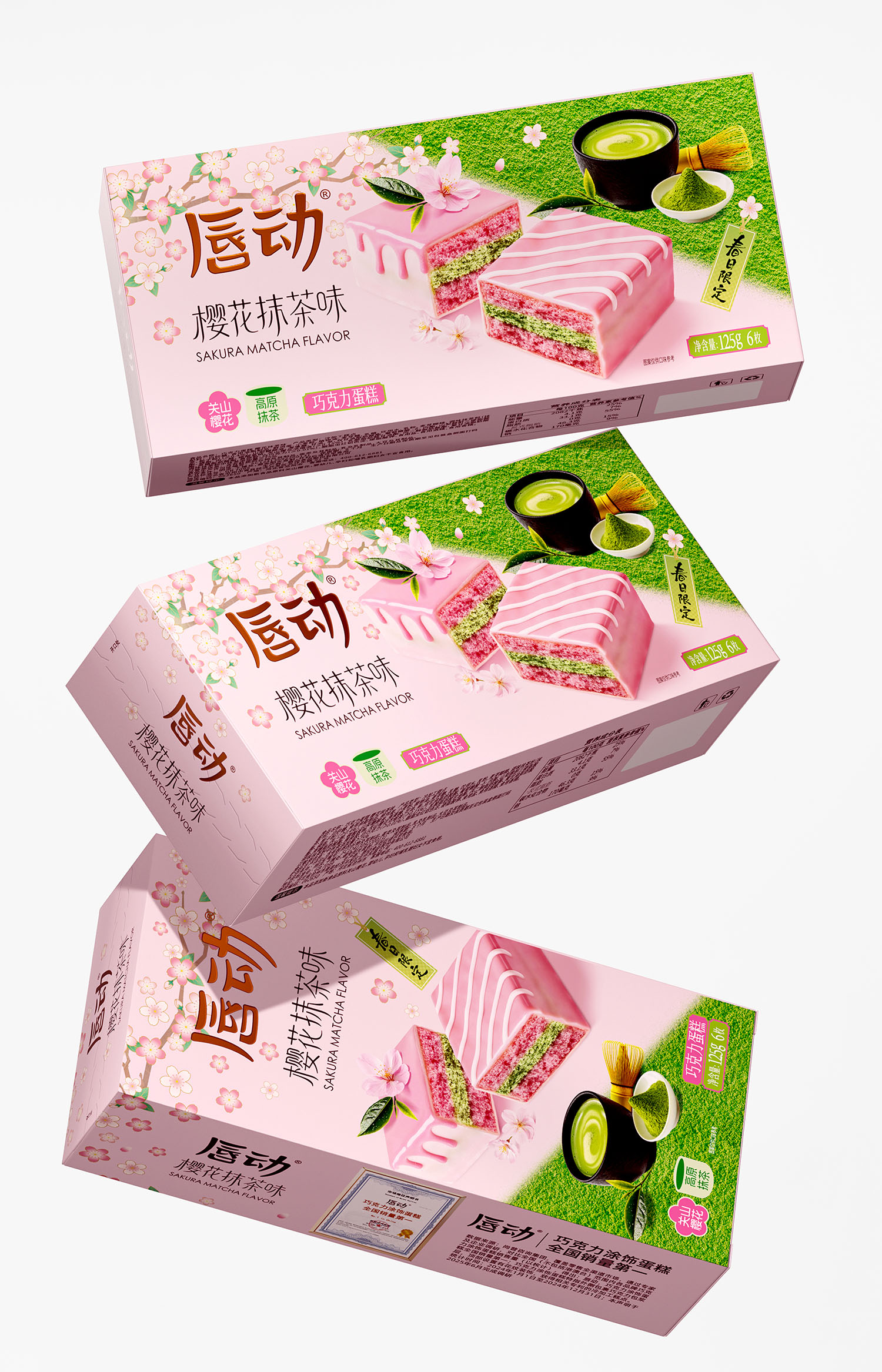 品尝一口春天浪漫 —— 唇动樱花抹茶味蛋糕包装,以春天意象为创意原点,将樱花的柔粉与抹茶的鲜绿凝于盒面,让消费者在指尖触碰间,先一步邂逅春日诗意。